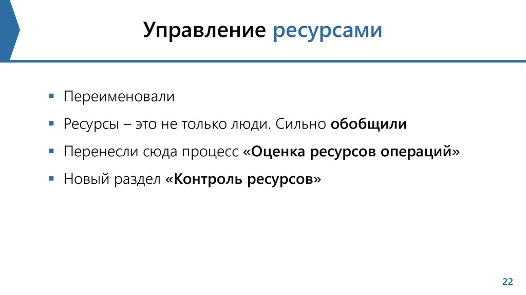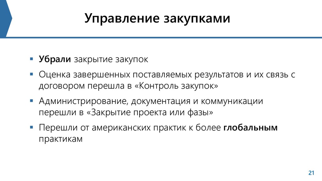 результатов и их связь с договором перешла в «Контроль закупок» Администрирование, документация и коммуникации перешли в «Закрытие проекта или фазы» Перешли от американских практик к более глобальным практикам 21