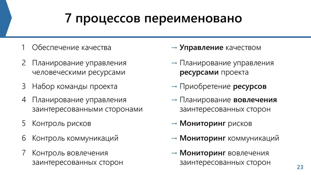 2 Планирование управления человеческими ресурсами → Планирование управления ресурсами проекта 3 Набор команды проекта → Приобретение ресурсов 4 Планирование управления заинтересованными сторонами → Планирование вовлечения заинтересованных сторон 5 Контроль рисков → Мониторинг рисков 6 Контроль коммуникаций → Мониторинг коммуникаций 7 Контроль вовлечения заинтересованных сторон → Мониторинг вовлечения заинтересованных сторон