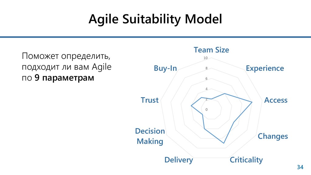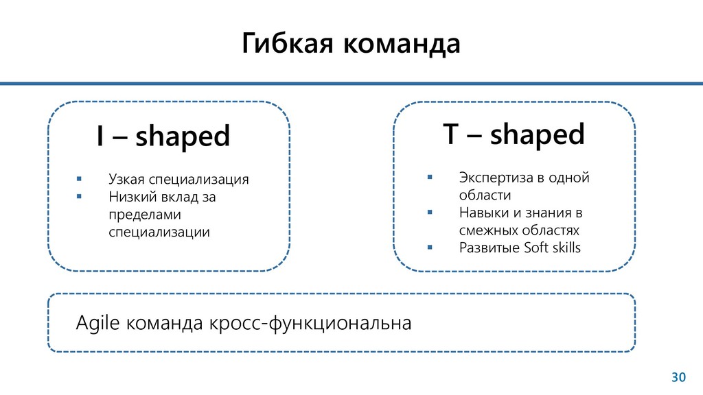 Низкий вклад за пределами специализации Agile команда кросс-функциональна T – shaped Экспертиза в одной области Навыки и знания в смежных областях Развитые Soft skills
