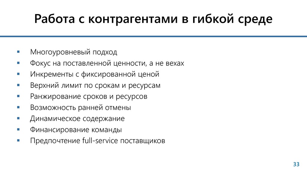 Фокус на поставленной ценности, а не вехах Инкременты с фиксированной ценой Верхний лимит по срокам и ресурсам Ранжирование сроков и ресурсов Возможность ранней отмены Динамическое содержание Финансирование команды Предпочтение full-service поставщиков