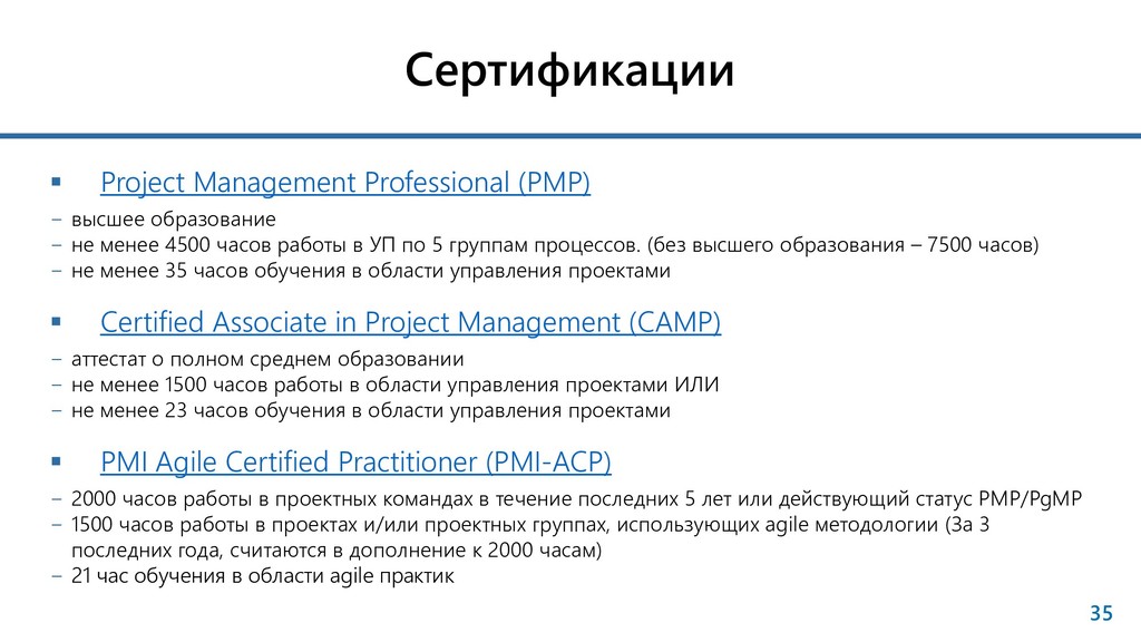 − не менее 4500 часов работы в УП по 5 группам процессов. (без высшего образования – 7500 часов) − не менее 35 часов обучения в области управления проектами Certified Associate in Project Management (САMP) − аттестат о полном среднем образовании − не менее 1500 часов работы в области управления проектами ИЛИ − не менее 23 часов обучения в области управления проектами PMI Agile Certified Practitioner (PMI-ACP) − 2000 часов работы в проектных командах в течение последних 5 лет или действующий статус PMP/PgMP − 1500 часов работы в проектах и/или проектных группах, использующих agile методологии (За 3 последних года, считаются в дополнение к 2000 часам) − 21 час обучения в области agile практик