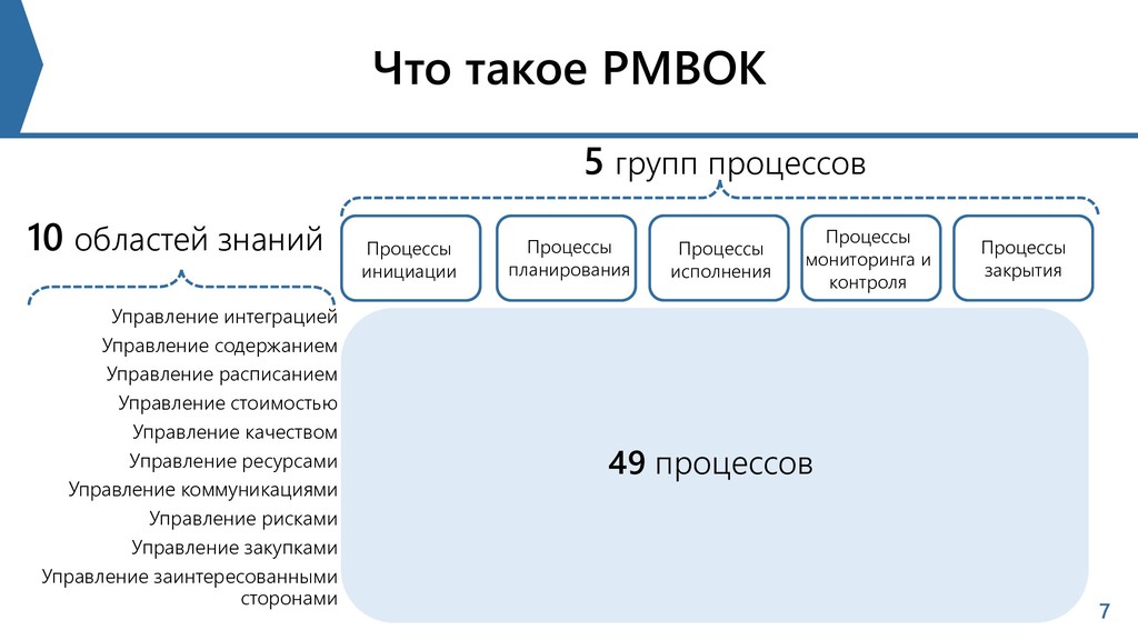 стоимостью Управление качеством Управление ресурсами Управление коммуникациями Управление рисками Управление закупками Управление заинтересованными сторонами 49 процессов 5 групп процессов 10 областей знаний Процессы инициации Процессы планирования Процессы исполнения Процессы мониторинга и контроля Процессы закрытия 7
