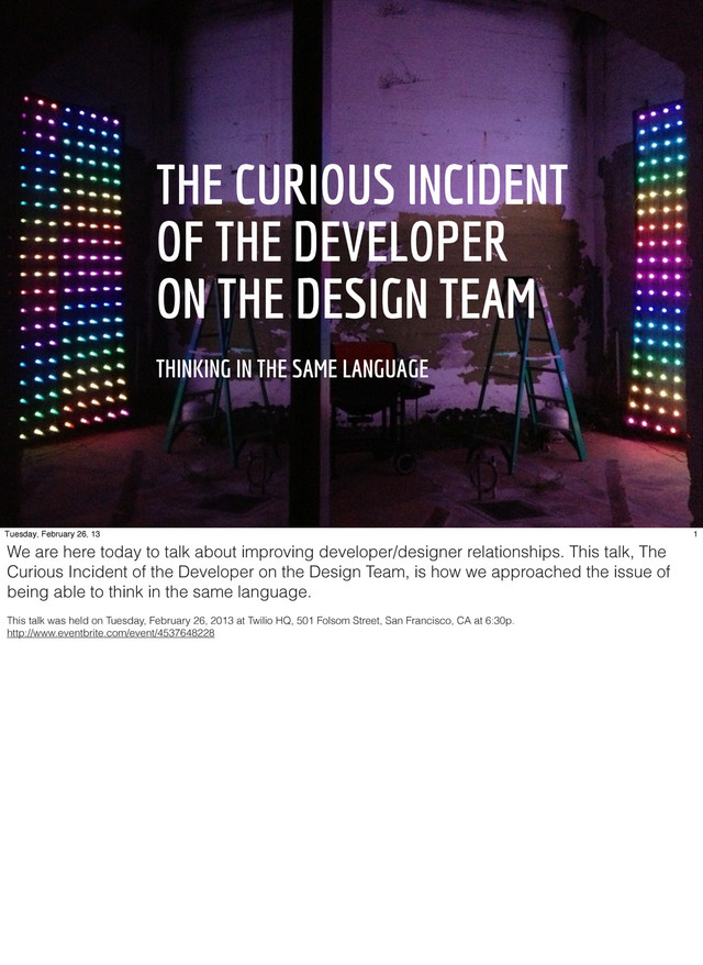 THINKING IN THE SAME LANGUAGE 1 Tuesday, February 26, 13 We are here today to talk about improving developer/designer relationships. This talk, The Curious Incident of the Developer on the Design Team, is how we approached the issue of being able to think in the same language. This talk was held on Tuesday, February 26, 2013 at Twilio HQ, 501 Folsom Street, San Francisco, CA at 6:30p. http://www.eventbrite.com/event/4537648228
