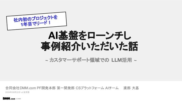 合同会社DMM.com PF開発本部 第一開発部 CSプラットフォーム AIチーム 渡部 大基 2024年09月22日 at 技育祭 社内初のプロジェクトを 1年目でリード!