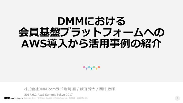 ご清聴ありがとうございました 本日のプレゼンテーションはDMMで構築したAWSシステムに関する技術者の現時点(2017.6.2)での感想に基づいています。 DMMは第三者の製品・サービスについて、特定の製造者やサービス提供者につき、製品やサービスを評価するものではありません。 DMMは第三者の製品・サービスについて、何らかの保証を提供するものではありません。 Copyright © 2017 DMM.com Co., Ltd.