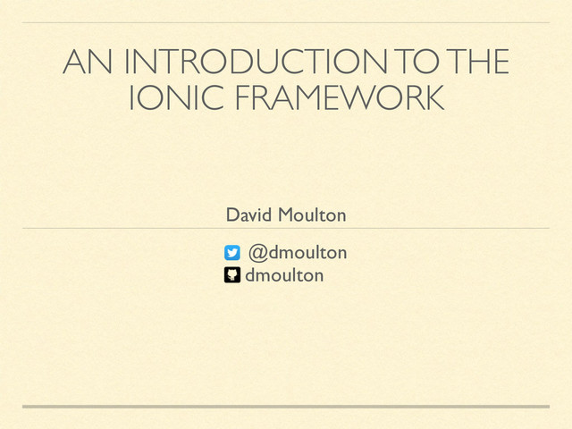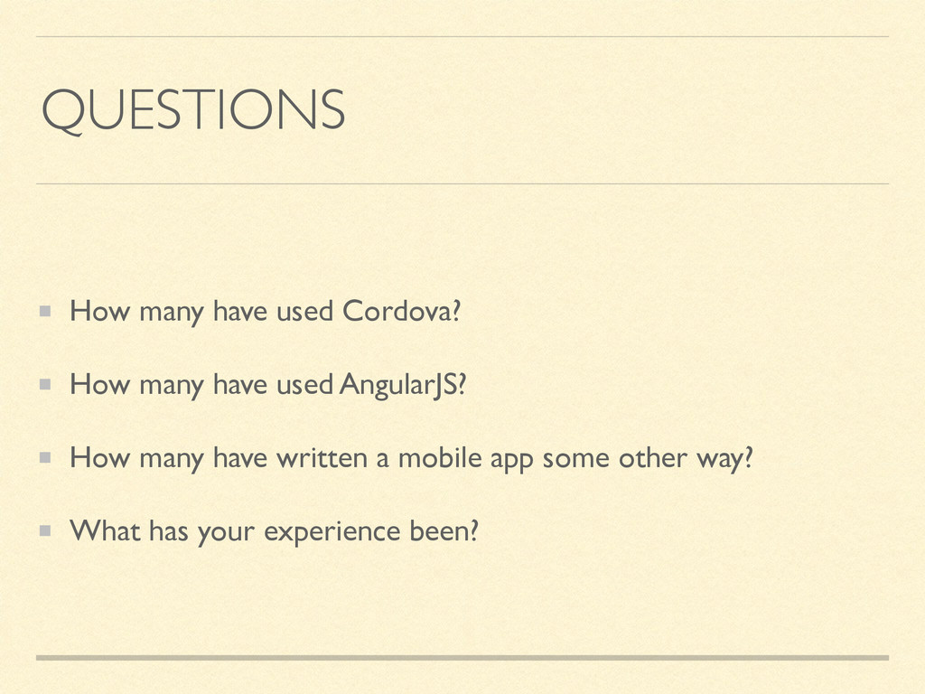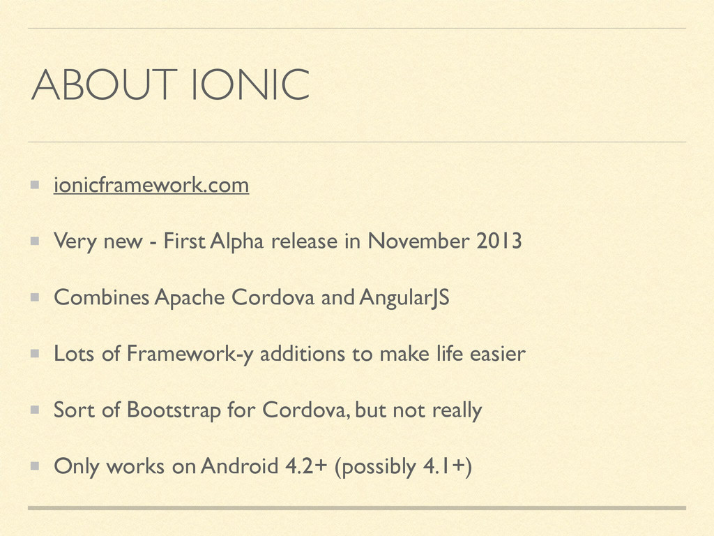 November 2013 Combines Apache Cordova and AngularJS Lots of Framework-y additions to make life easier Sort of Bootstrap for Cordova, but not really Only works on Android 4.2+ (possibly 4.1+)