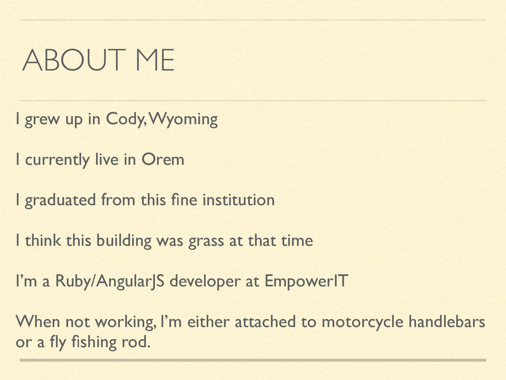 currently live in Orem ! I graduated from this fine institution ! I think this building was grass at that time ! I’m a Ruby/AngularJS developer at EmpowerIT ! When not working, I’m either attached to motorcycle handlebars or a fly fishing rod.