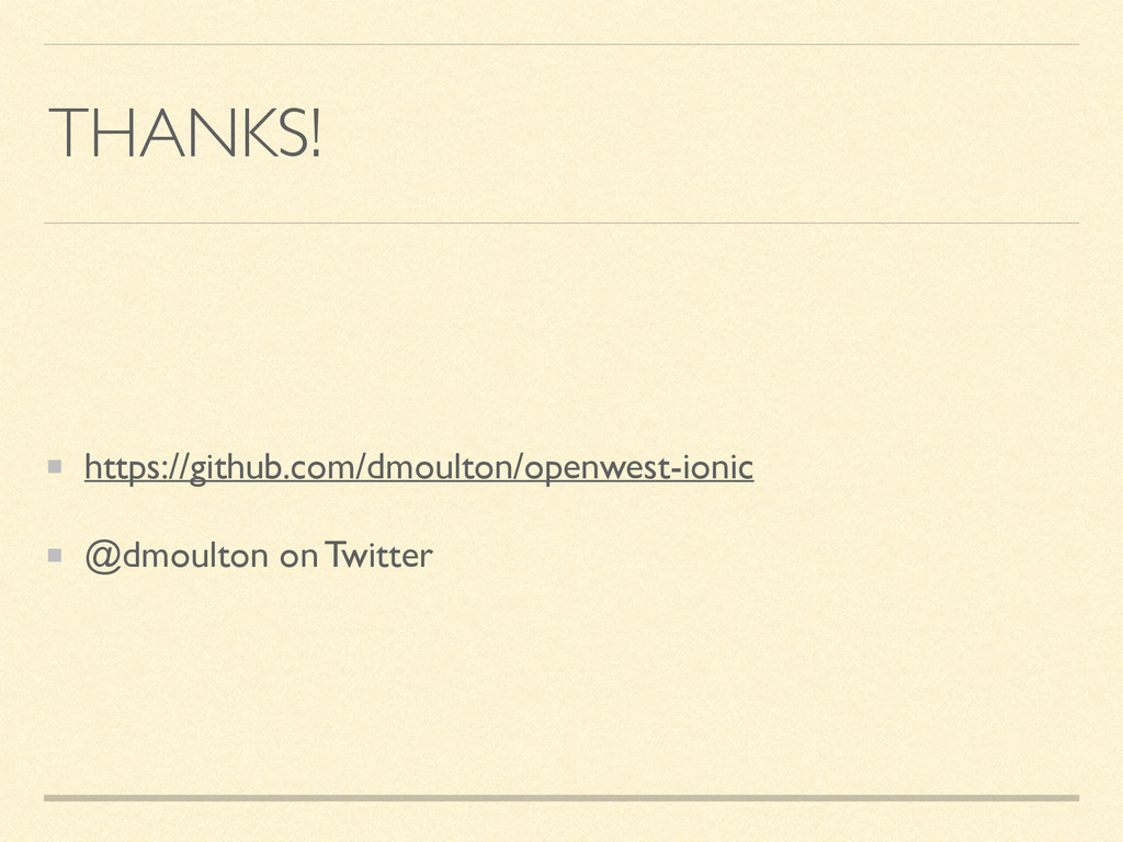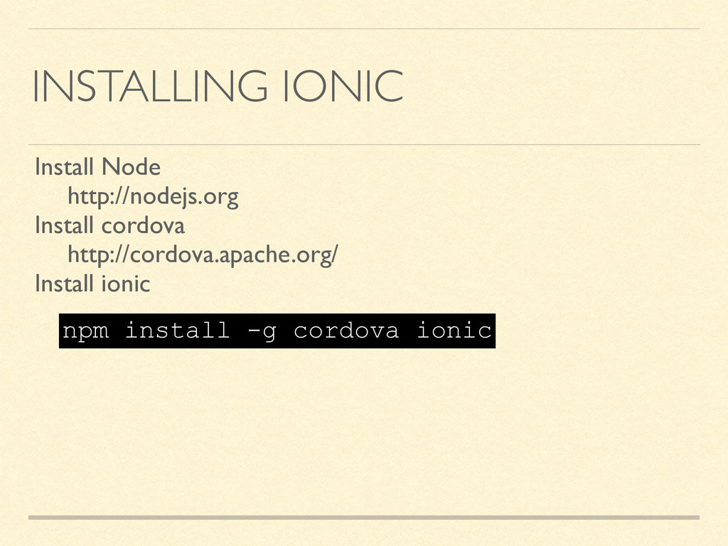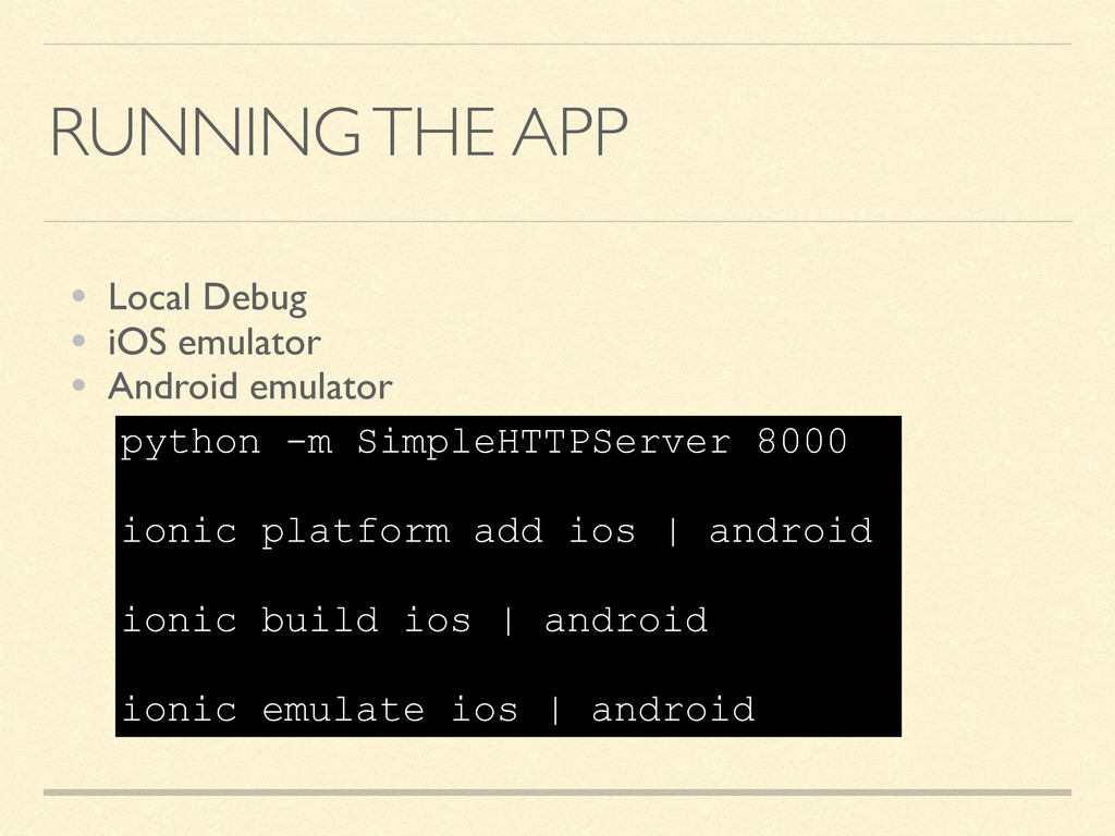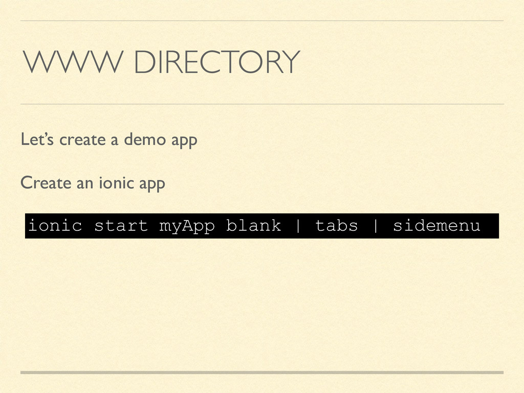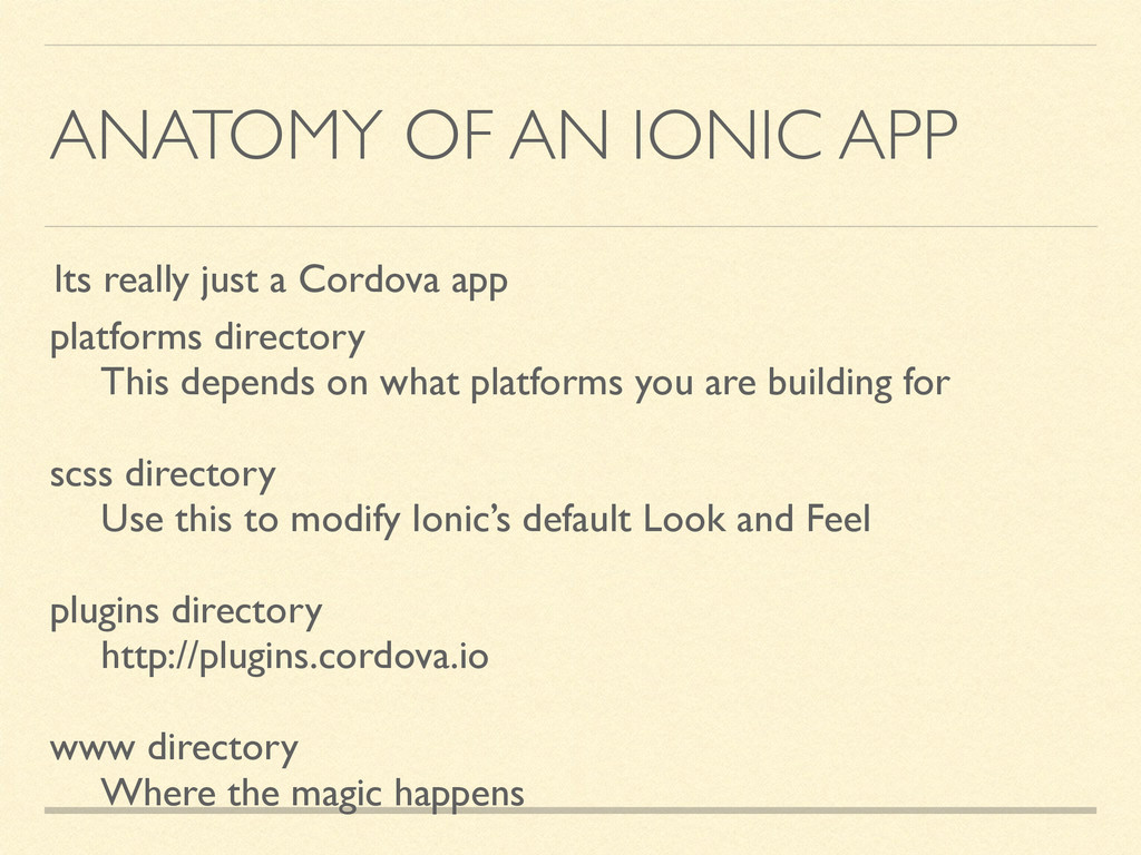 app ! ! platforms directory This depends on what platforms you are building for ! scss directory Use this to modify Ionic’s default Look and Feel ! plugins directory http://plugins.cordova.io ! www directory Where the magic happens