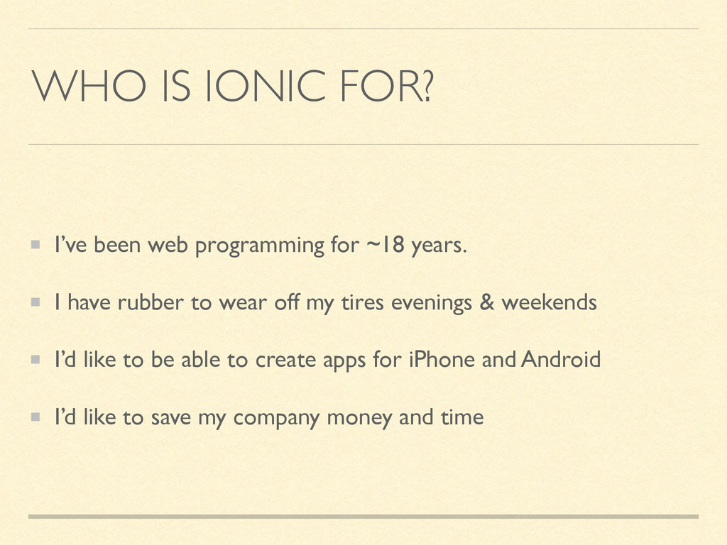 years. I have rubber to wear off my tires evenings & weekends I’d like to be able to create apps for iPhone and Android I’d like to save my company money and time