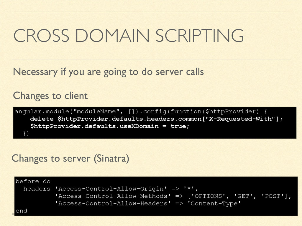 server calls ! Changes to client angular.module("moduleName", []).config(function($httpProvider) { delete $httpProvider.defaults.headers.common["X-Requested-With"]; $httpProvider.defaults.useXDomain = true; }) Changes to server (Sinatra) before do headers 'Access-Control-Allow-Origin' => '*', 'Access-Control-Allow-Methods' => ['OPTIONS', 'GET', 'POST'], 'Access-Control-Allow-Headers' => 'Content-Type' end