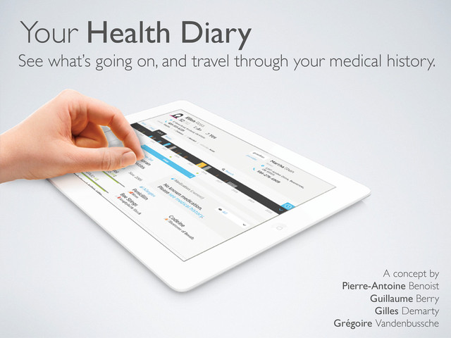room. With a single glance at his Health Diary, you know him better than himself. Yet that’s not all: when you need to learn more about your patient, you tap your way into his medical history. Being Gregory House has never been easier! For you, Health Diary owner The Health Diary gives you an instant overview of your current health. There’s more! You can travel through time to see your next medical appointments or recall what happened in the past. Call Marty and start the DeLorean! For you, Doctors