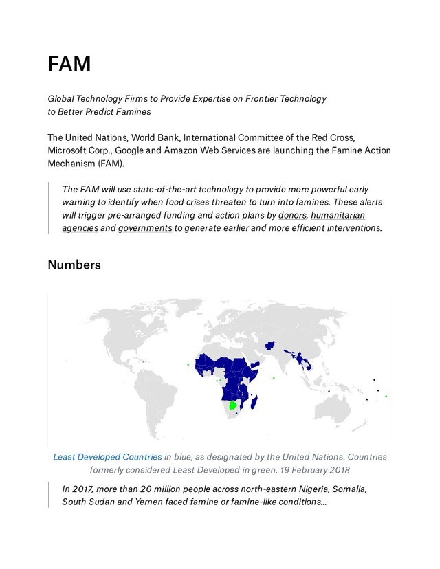 to Better Predict Famines The United Nations, World Bank, International Committee of the Red Cross, Microsoft Corp., Google and Amazon Web Services are launching the Famine Action Mechanism (FAM). The FAM will use state-of-the-art technology to provide more powerful early warning to identify when food crises threaten to turn into famines. These alerts will trigger pre-arranged funding and action plans by donors, humanitarian agencies and governments to generate earlier and more efficient interventions. Numbers Least Developed Countries in blue, as designated by the United Nations. Countries formerly considered Least Developed in green. 19 February 2018 In 2017, more than 20 million people across north-eastern Nigeria, Somalia, South Sudan and Yemen faced famine or famine-like conditions…