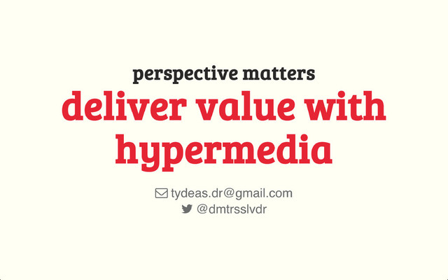 An API should be designed from the perspective of the caller. A Hypermedia design can empower the product “value” delivered within the API and approximate the value a user, who interacts with a UI, gets. During this presentation I would like to touch on the subject of common pitfalls that lead us to design an API from the wrong perspective, to reference types of our potential clients and provide examples on how hypermedia could help us honor our business.