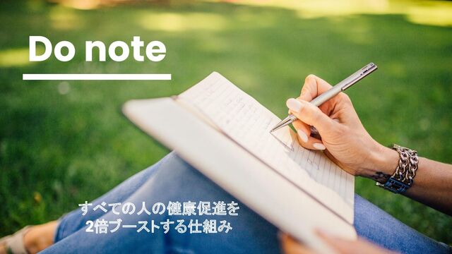 対面型・少人数制運動プログラム実施 ✅ 運動プログラム実施後すぐに Do note(健康データ)の記録 行動改善の示唆出しだけではなく、データから分かる改善を実施して確実に 定着することを目指しています。 Do X 参加者の健康数値可視化・ AIによる課題抽出。 行動改善を促す 健康データに対して専門家アドバイスやパートナー 企業によるトレーニングの実施 Change Experience Platform事業 ✅ 収集した健康データをまずは必要な人に届ける ✅ データから専門家などの人のアドバイスを提供 ✅ データのConnectivityを最大化 データからその人の健康改善の最大化をサポート Google Fitなど外部健康データとの連携 運動など行動改善の実施 Do noteの記録 データ蓄積 アドバイス、謝礼 自己申告によるメンタル状態や体の痛みなどの記録と時間による推移が確認でき、また Google Fitなど外部の健康 アプリと連動した歩数計の可視化ができます。行動改善を伴ったデータの記録に従って、デジタルギフト謝礼を送付し、 そのモチベーションを更に上げていくシステムです。
