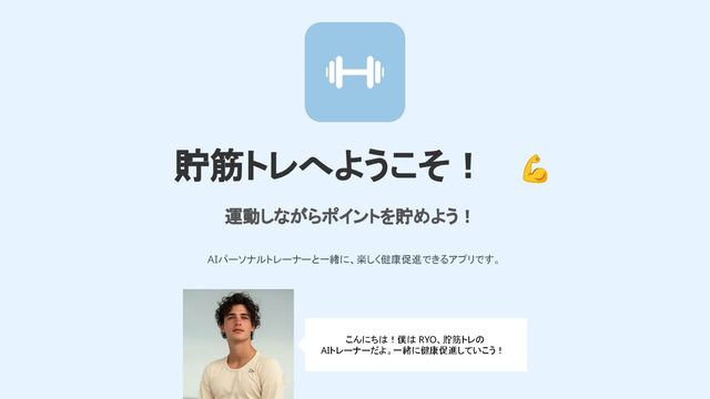 貯筋トレへようこそ! 💪 運動しながらポイントを貯めよう! AIパーソナルトレーナーと一緒に、楽しく健康促進できるアプリです。 こんにちは!僕は RYO、貯筋トレの AIトレーナーだよ。一緒に健康促進していこう!