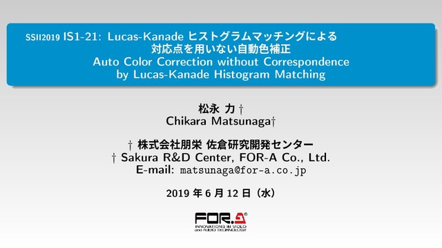 ͷޯ ∇href ΛධՁ͢Δɽ 4: (x; 0) ͰϠίϏߦྻ ∂W ∂p ΛධՁ͢Δɽ 5: ࠷ٸ߱Լը૾ ∇href ∂W ∂p Λܭࢉ͢Δɽ 6: ࣍ͷϔοηߦྻͷٯߦྻΛܭࢉ͢Δɽ H = ∑ x ( ∇href ∂W ∂p )⊤ ( ∇href ∂W ∂p ) ˌ खॱͷ൪߸ɼLucas-Kanade ΞϧΰϦζϜͱରԠ͍ͯ͠Δɽ 6 B. D. Lucas and T. Kanade, An iterative image registration technique with an application to stereo vision, Proceedings of the 7th International Joint Conference on Articial Intelligence - Volume 2 (IJCAI'81), Vancouver, BC, Canada, August 1981, pp. 674679. 7 S. Baker and I. Matthews, Lucas-Kanade 20 years on: A unifying framework, International Journal of Computer Vision, #$-3 (2004), 221255. 8 দӬ ྗ, ը૾͔Βͷഒ৭ऩࠩͷࣗಈਪఆิਖ਼, ୈ 20 ճը૾ηϯγϯάγϯϙδϜ (SSII2014) ߨԋจू, ԣ (ύγϑΟίԣ), 2014 6 ݄. 9 দӬ ྗ, ରԠΛ༻͍ͳ͍ϩʔϦϯάγϟολʔΈิਖ਼ͱө૾ͷ҆ఆԽ ʙ ฒਐ͔Βճస, ୈ 21 ճը૾ηϯγϯάγϯϙδϜ (SSII2015) ߨԋจू, ԣ (ύγϑΟίԣ), 2015 6 ݄. দӬ ྗ (๎ӫ) Lucas-Kanade ώετάϥϜϚονϯά 2019 6 ݄ 12 ʢਫʣ 17 / 30