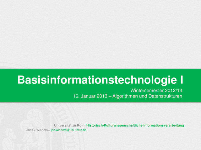 Liste von Einträgen Start der Suche bei mittlerem Eintrag; Vergleich des Suchschlüssels mit dem Eintrag Ist der gesuchte Eintrag gefunden, so ist die Suche beendet Ansonsten: Suche in der linken oder der rechten Hälfte der Einträge - je nachdem, ob der gelesene Schlüssel größer oder kleiner war als der Suchschlüssel Verfahren so lange, bis der Eintrag gefunden ist oder bis keine Halbierung des Suchraums mehr möglich ist (d.h. man ist an der Stelle angekommen, an der der Eintrag eigentlich stehen müsste). Binäre Suche Quelle und Bildnachweis: http://www-i1.informatik.rwth-aachen.de/~algorithmus/algo1.php
