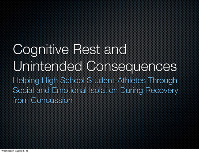 August 2015 Presentation from American Psychological Association Annual Convention addressing the secondary social and psychological issues that arise from "Cognitive Rest" protocols for concussion recovery in adolescents.