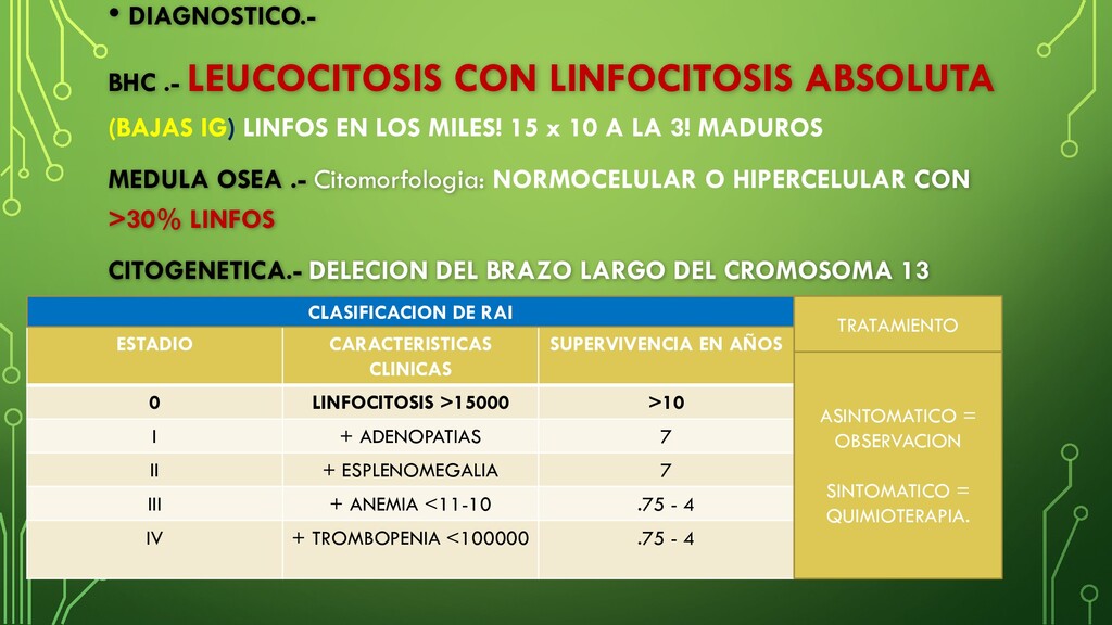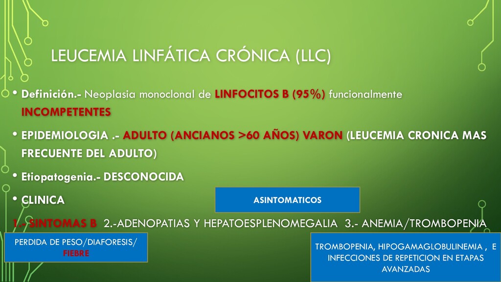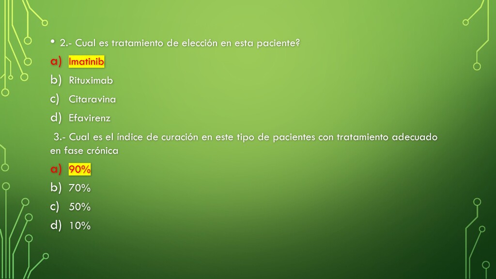 de edad. Su madre refiere malestar general durante las ultimas dos semanas asi como sudoración nocturna que se acompaña de perdida de peso significativa por los últimos 2 meses. Presenta muestras de laboratorio con los siguientes resultados, Hb 7mg/dl Leucocitos: 5000, Glucosa 80mg/dl, Examen general de orina dentro de parámetros normales. A la exploración física paciente presenta marcada afeccion al estado general, astenia, adinamia, se palpan adenopatias cervicales bilaterales asi como hepato esplenomegalia. Se solicita frotis sanguíneo con mas de 20% de blastos y traslocacion 9:22. • 1.- ¿Cual es el diagnostico mas probable de este paciente? a) Linfoma de hodking b) Linfoma no hodking c) Leucemia mieloide aguda d) Leucemia linfocítica aguda