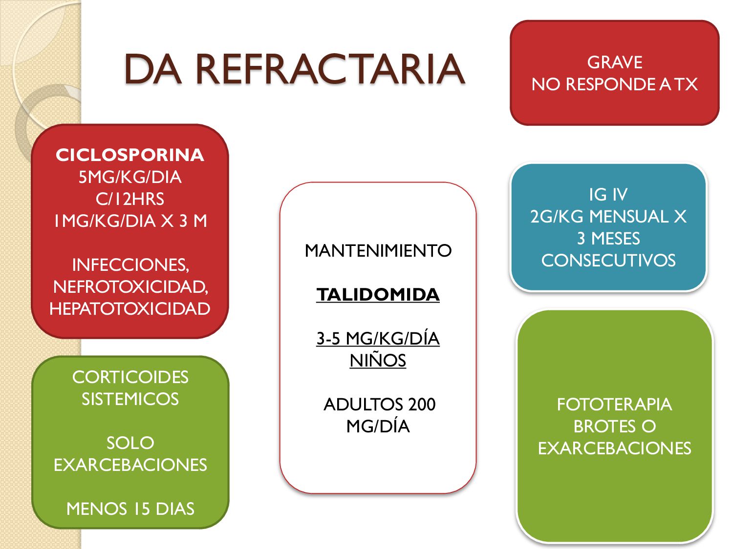 NEFROTOXICIDAD, HEPATOTOXICIDAD GRAVE NO RESPONDE A TX CORTICOIDES SISTEMICOS SOLO EXARCEBACIONES MENOS 15 DIAS MANTENIMIENTO TALIDOMIDA 3-5 MG/KG/DÍA NIÑOS ADULTOS 200 MG/DÍA IG IV 2G/KG MENSUAL X 3 MESES CONSECUTIVOS FOTOTERAPIA BROTES O EXARCEBACIONES