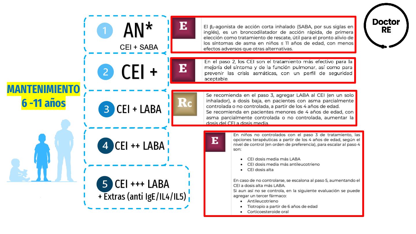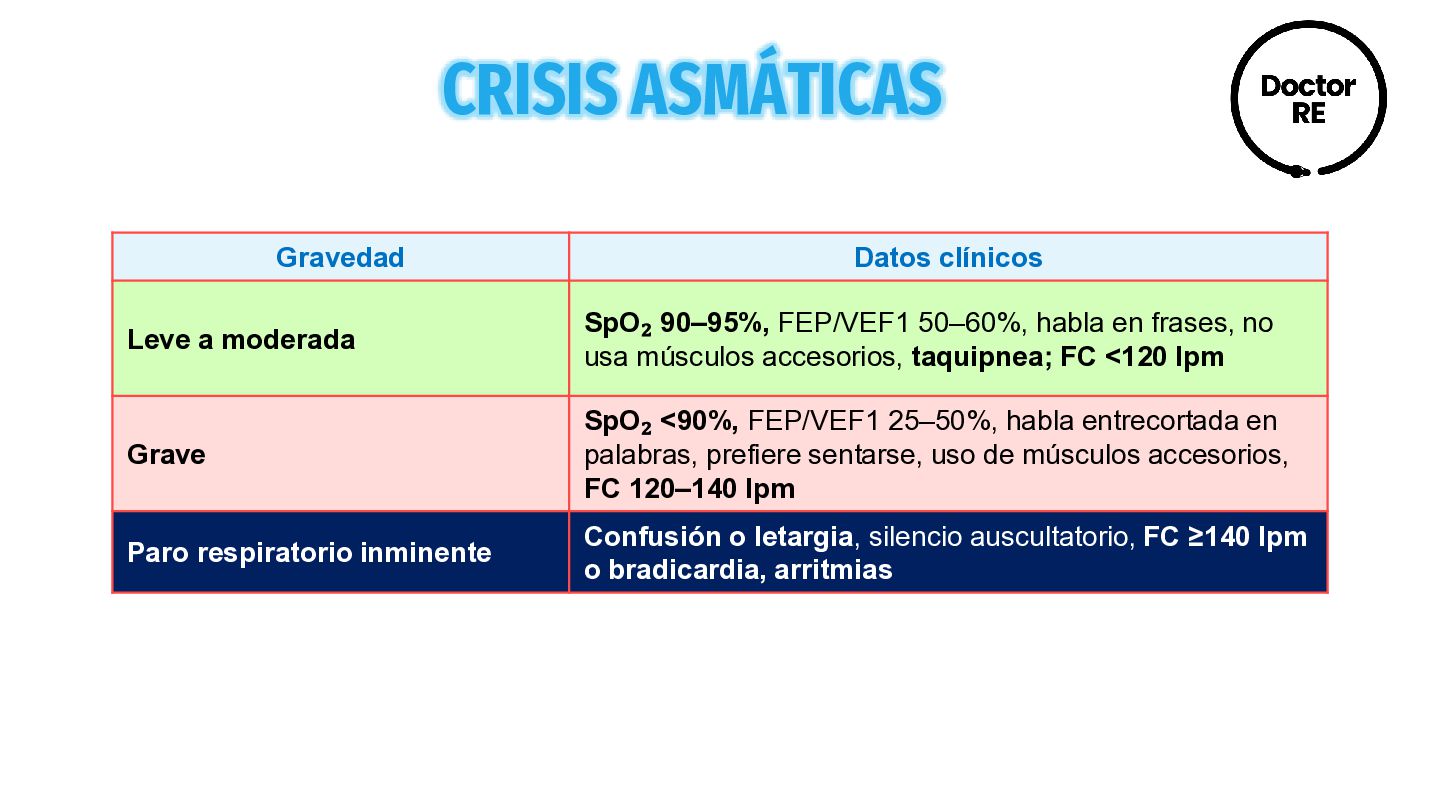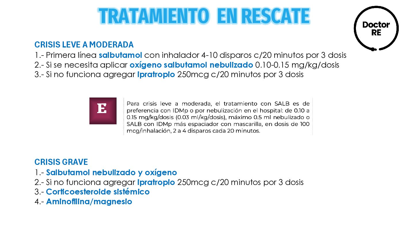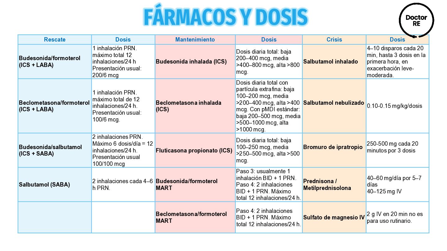 1 inhalación PRN. máximo total 12 inhalaciones/24 h Presentación usual: 200/6 mcg Budesonida inhalada (ICS) Dosis diaria total: baja 200–400 mcg, media >400–800 mcg, alta >800 mcg. Salbutamol inhalado 4–10 disparos cada 20 min, hasta 3 dosis en la primera hora, en exacerbación leve- moderada. Beclometasona/formoterol (ICS + LABA) 1 inhalación PRN. máximo total de 12 inhalaciones/24 h. Presentación usual: 100/6 mcg. Beclometasona inhalada (ICS) Dosis diaria total con partícula extrafina: baja 100–200 mcg, media >200–400 mcg, alta >400 mcg. Con pMDI estándar: baja 200–500 mcg, media >500–1000 mcg, alta >1000 mcg. Salbutamol nebulizado 0.10-0.15 mg/kg/dosis Budesonida/salbutamol (ICS + SABA) 2 inhalaciones PRN. Máximo 6 dosis/día = 12 inhalaciones/24 h. Presentación usual 100/100 mcg Fluticasona propionato (ICS) Dosis diaria total: baja 100–250 mcg, media >250–500 mcg, alta >500 mcg. Bromuro de ipratropio 250-500 mg cada 20 minutos por 3 dosis Salbutamol (SABA) 2 inhalaciones cada 4–6 h PRN. Budesonida/formoterol MART Paso 3: usualmente 1 inhalación BID + 1 PRN. Paso 4: 2 inhalaciones BID + 1 PRN. Máximo total 12 inhalaciones/24 h. Prednisona / Metilprednisolona 40–60 mg/día por 5–7 días 40–125 mg IV Beclometasona/formoterol MART Paso 4: 2 inhalaciones BID + 1 PRN. Máximo total 12 inhalaciones/24 h. Sulfato de magnesio IV 2 g IV en 20 min no es para uso rutinario. FÁRMACOS Y DOSIS