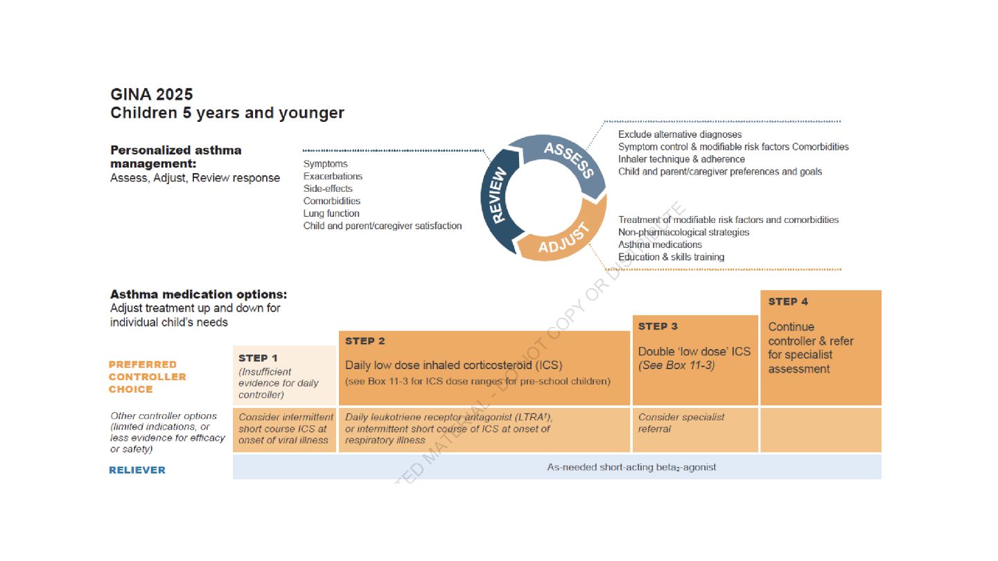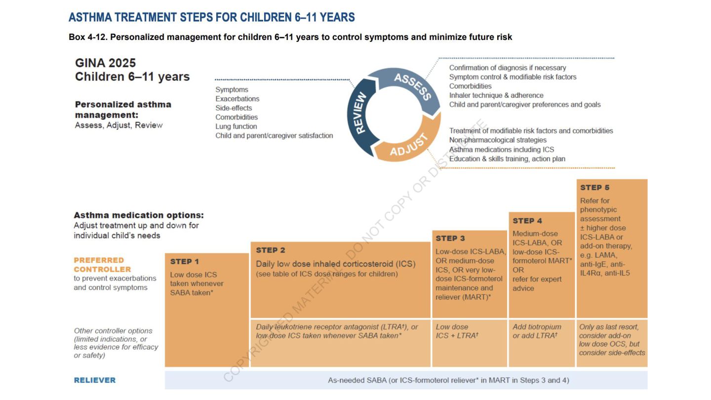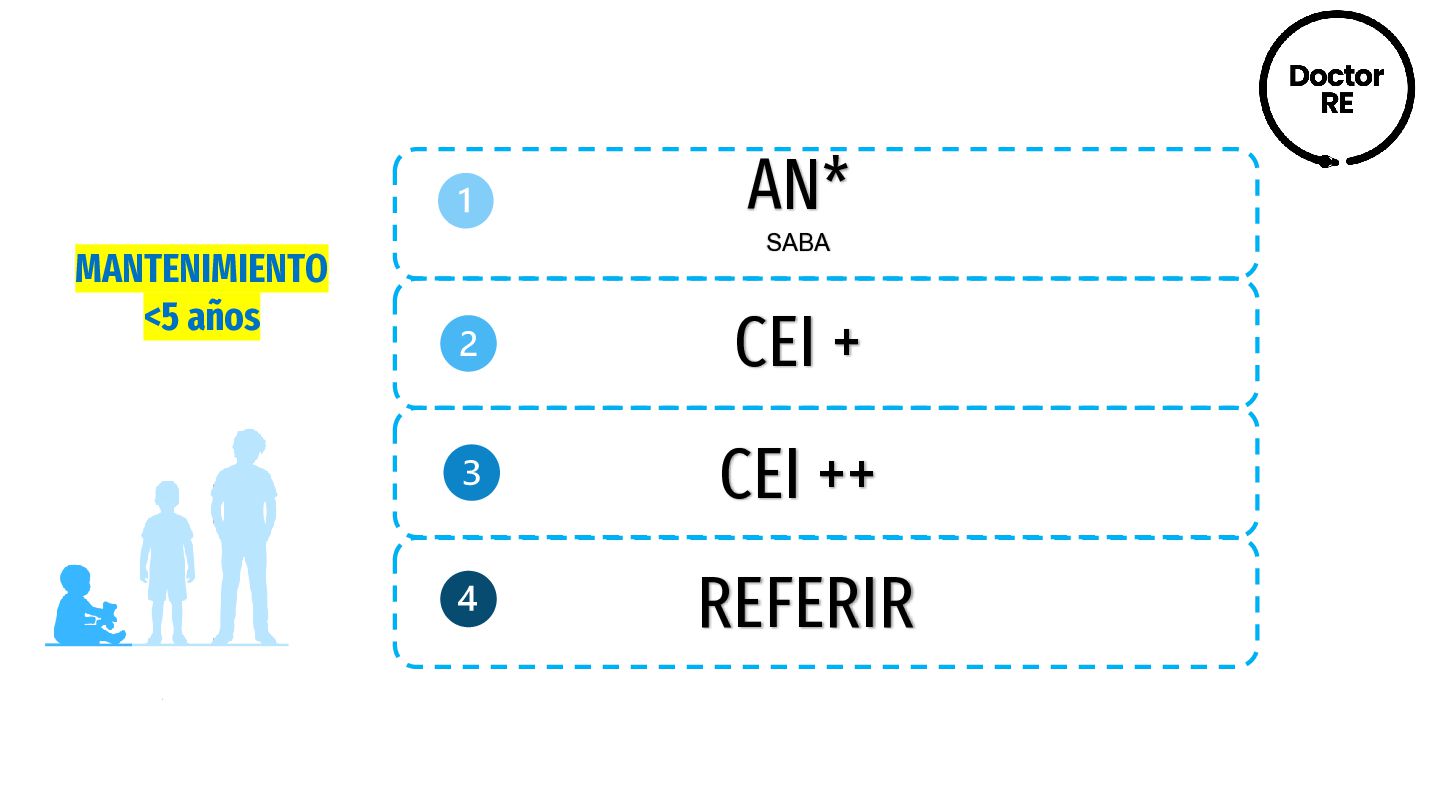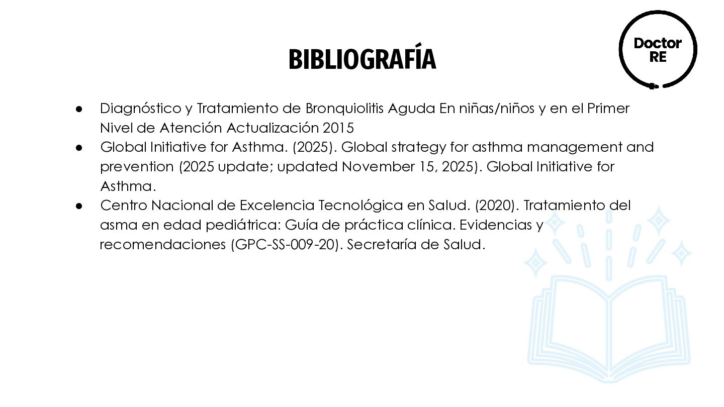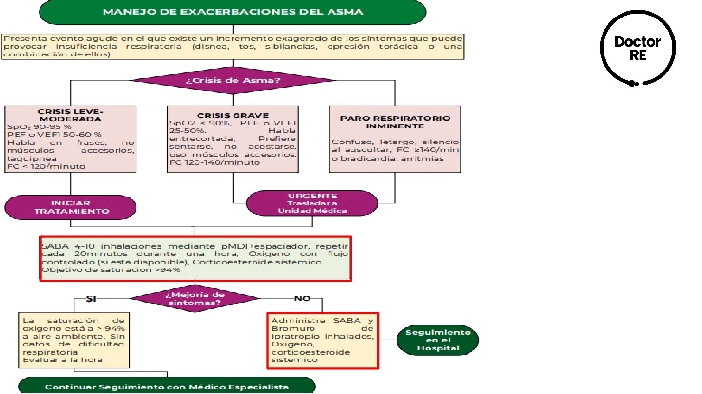 1 inhalación PRN. máximo total 12 inhalaciones/24 h Presentación usual: 200/6 mcg Budesonida inhalada (ICS) Dosis diaria total: baja 200–400 mcg, media >400–800 mcg, alta >800 mcg. Salbutamol inhalado 4–10 disparos cada 20 min, hasta 3 dosis en la primera hora, en exacerbación leve- moderada. Beclometasona/formoterol (ICS + LABA) 1 inhalación PRN. máximo total de 12 inhalaciones/24 h. Presentación usual: 100/6 mcg. Beclometasona inhalada (ICS) Dosis diaria total con partícula extrafina: baja 100–200 mcg, media >200–400 mcg, alta >400 mcg. Con pMDI estándar: baja 200–500 mcg, media >500–1000 mcg, alta >1000 mcg. Salbutamol nebulizado 0.10-0.15 mg/kg/dosis Budesonida/salbutamol (ICS + SABA) 2 inhalaciones PRN. Máximo 6 dosis/día = 12 inhalaciones/24 h. Presentación usual 100/100 mcg Fluticasona propionato (ICS) Dosis diaria total: baja 100–250 mcg, media >250–500 mcg, alta >500 mcg. Bromuro de ipratropio 250-500 mg cada 20 minutos por 3 dosis Salbutamol (SABA) 2 inhalaciones cada 4–6 h PRN. Budesonida/formoterol MART Paso 3: usualmente 1 inhalación BID + 1 PRN. Paso 4: 2 inhalaciones BID + 1 PRN. Máximo total 12 inhalaciones/24 h. Prednisona / Metilprednisolona 40–60 mg/día por 5–7 días 40–125 mg IV Beclometasona/formoterol MART Paso 4: 2 inhalaciones BID + 1 PRN. Máximo total 12 inhalaciones/24 h. Sulfato de magnesio IV 2 g IV en 20 min no es para uso rutinario. FÁRMACOS Y DOSIS