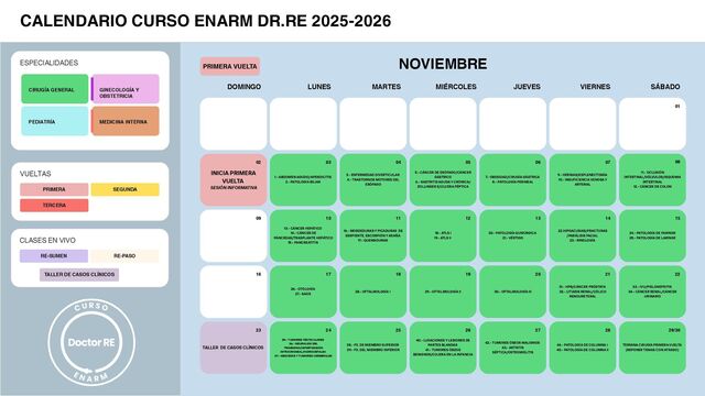 13, 14 Y 15 CIRUGÍA TEMAS: 34, 35 Y 36 CIRUGÍA TEMAS: 31, 32 Y 33 GYO TEMAS: 7, 8 y 9 GYO TEMAS: 4, 5 y 6 PEDIATRÍA TEMAS: 4, 5 Y 6 PEDIATRÍA TEMAS: 1, 2 Y 3 CIRUGÍA TEMAS: 10, 11 Y 12 CIRUGÍA TEMAS: 28, 29 Y 30 GYO TEMAS: 1,2 y 3 GYO TEMAS: 19, 20 Y 21 TERMINA GYO TERCERA VUELTA CIRUGÍA TEMAS: 7, 8 Y 9 CIRUGÍA TEMAS: 25, 26 Y 27 CIRUGÍA TEMAS: 43, 44 Y 45 TERMINA CIRUGÍA TERCERA VUELTA GYO TEMAS: 16, 17 Y 18 PEDIATRÍA TEMAS: 13, 14 Y 15 CIRUGÍA TEMAS: 22, 23 Y 24 CIRUGÍA TEMAS: 40,41 Y 42 GYO TEMAS: 13, 14 Y 15 PEDIATRÍA TEMAS: 10, 11 Y 12 CIRUGÍA TEMAS: 19, 20 Y 21 CIRUGÍA TEMAS: 37,38 Y 39 GYO TEMAS: 10, 11 Y 12 PEDIATRÍA TEMAS: 7, 8 Y 9 RE-PASO 5 RE-PASO 6 RE-PASO 7 RE-PASO 8 04 SÁBADO 03 VIERNES 11 10 18 17 25 24 02 JUEVES 09 16 23 01 MIÉRCOLES JULIO 08 15 22 29 MARTES 07 14 21 28 LUNES 06 13 20 27 DOMINGO 05 12 19 26 PEDIATRÍA TEMAS: 19, 20 Y 21 PEDIATRÍA TEMAS: 16, 17 Y 18 31 30 PRIMERA SEGUNDA TERCERA VUELTAS ESPECIALIDADES CIRUGÍA GENERAL GINECOLOGÍA Y OBSTETRICIA PEDIATRÍA MEDICINA INTERNA CALENDARIO CURSO ENARM DR.RE 2025-2026 RE-SUMEN RE-PASO CLASES EN VIVO TALLER DE CASOS CLÍNICOS