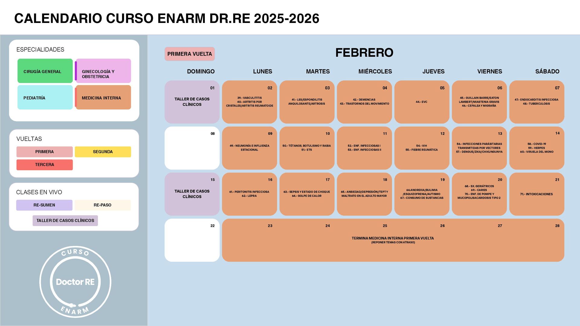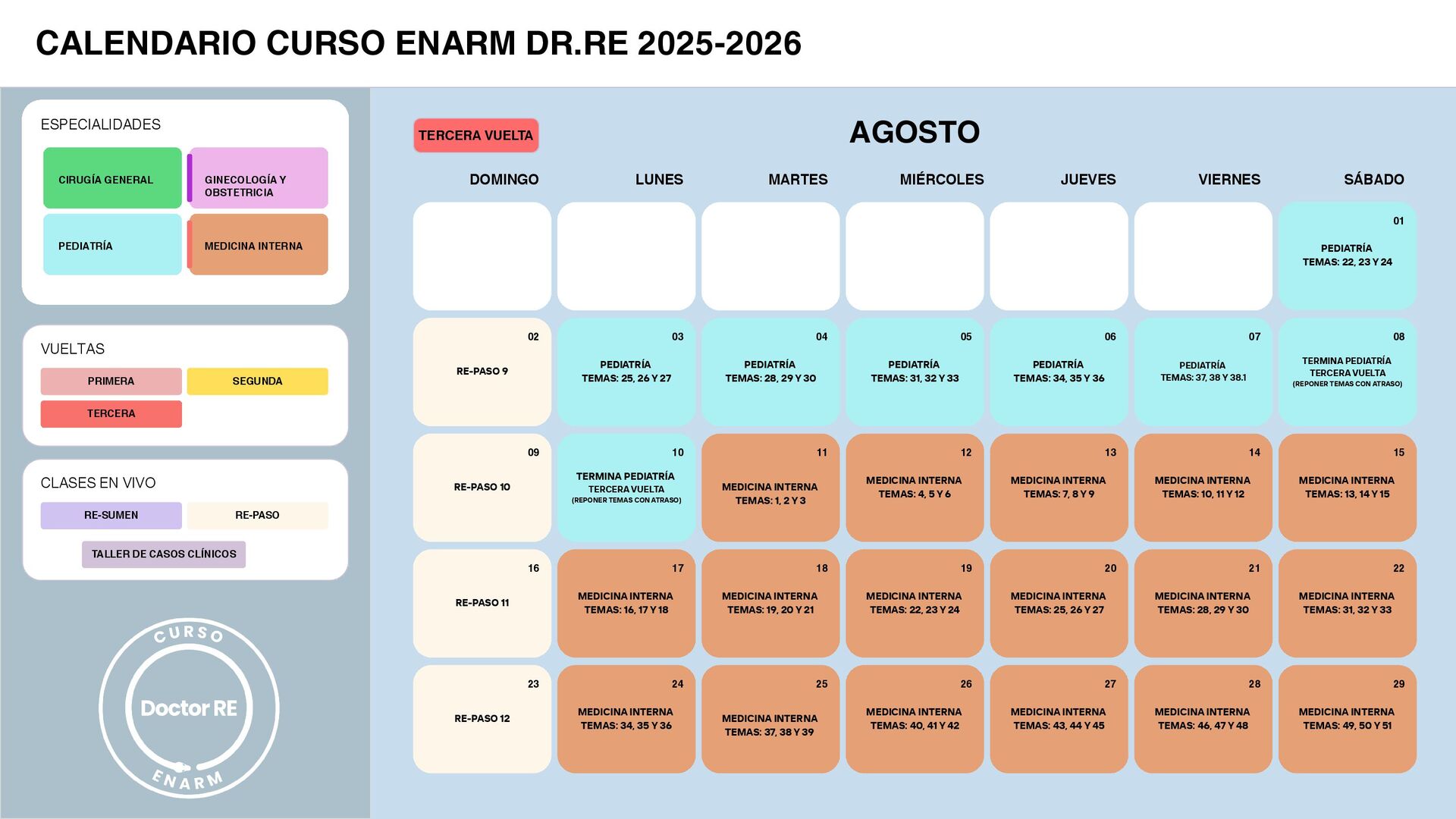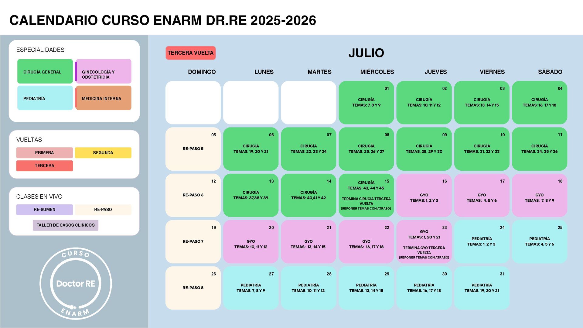 JUEVES MIÉRCOLES JULIO MARTES LUNES DOMINGO 05 12 19 26 PRIMERA SEGUNDA TERCERA VUELTAS ESPECIALIDADES CIRUGÍA GENERAL GINECOLOGÍA Y OBSTETRICIA PEDIATRÍA MEDICINA INTERNA CALENDARIO CURSO ENARM DR.RE 2025-2026 RE-SUMEN RE-PASO CLASES EN VIVO TALLER DE CASOS CLÍNICOS TERCERA VUELTA CIRUGÍA TEMAS: 16, 17 Y 18 CIRUGÍA TEMAS: 13, 14 Y 15 CIRUGÍA TEMAS: 10, 11 Y 12 CIRUGÍA TEMAS: 7, 8 Y 9 04 03 02 01 CIRUGÍA TEMAS: 34, 35 Y 36 CIRUGÍA TEMAS: 31, 32 Y 33 CIRUGÍA TEMAS: 28, 29 Y 30 CIRUGÍA TEMAS: 25, 26 Y 27 CIRUGÍA TEMAS: 22, 23 Y 24 CIRUGÍA TEMAS: 19, 20 Y 21 11 10 09 08 07 06 CIRUGÍA TEMAS: 43, 44 Y 45 TERMINA CIRUGÍA TERCERA VUELTA (REPONER TEMAS CON ATRASO) CIRUGÍA TEMAS: 40,41 Y 42 CIRUGÍA TEMAS: 37,38 Y 39 15 14 13 GYO TEMAS: 4, 5 Y 6 GYO TEMAS: 1, 2 Y 3 17 16 GYO TEMAS: 7, 8 Y 9 18 GYO TEMAS: 13, 14 Y 15 GYO TEMAS: 10, 11 Y 12 21 20 GYO TEMAS: 16, 17 Y 18 22 GYO TEMAS: 1, 20 Y 21 TERMINA GYO TERCERA VUELTA (REPONER TEMAS CON ATRASO) 23 PEDIATRÍA TEMAS: 4, 5 Y 6 PEDIATRÍA TEMAS: 1, 2 Y 3 25 24 PEDIATRÍA TEMAS: 13, 14 Y 15 PEDIATRÍA TEMAS: 10, 11 Y 12 PEDIATRÍA TEMAS: 7, 8 Y 9 29 28 27 PEDIATRÍA TEMAS: 19, 20 Y 21 PEDIATRÍA TEMAS: 16, 17 Y 18 31 30