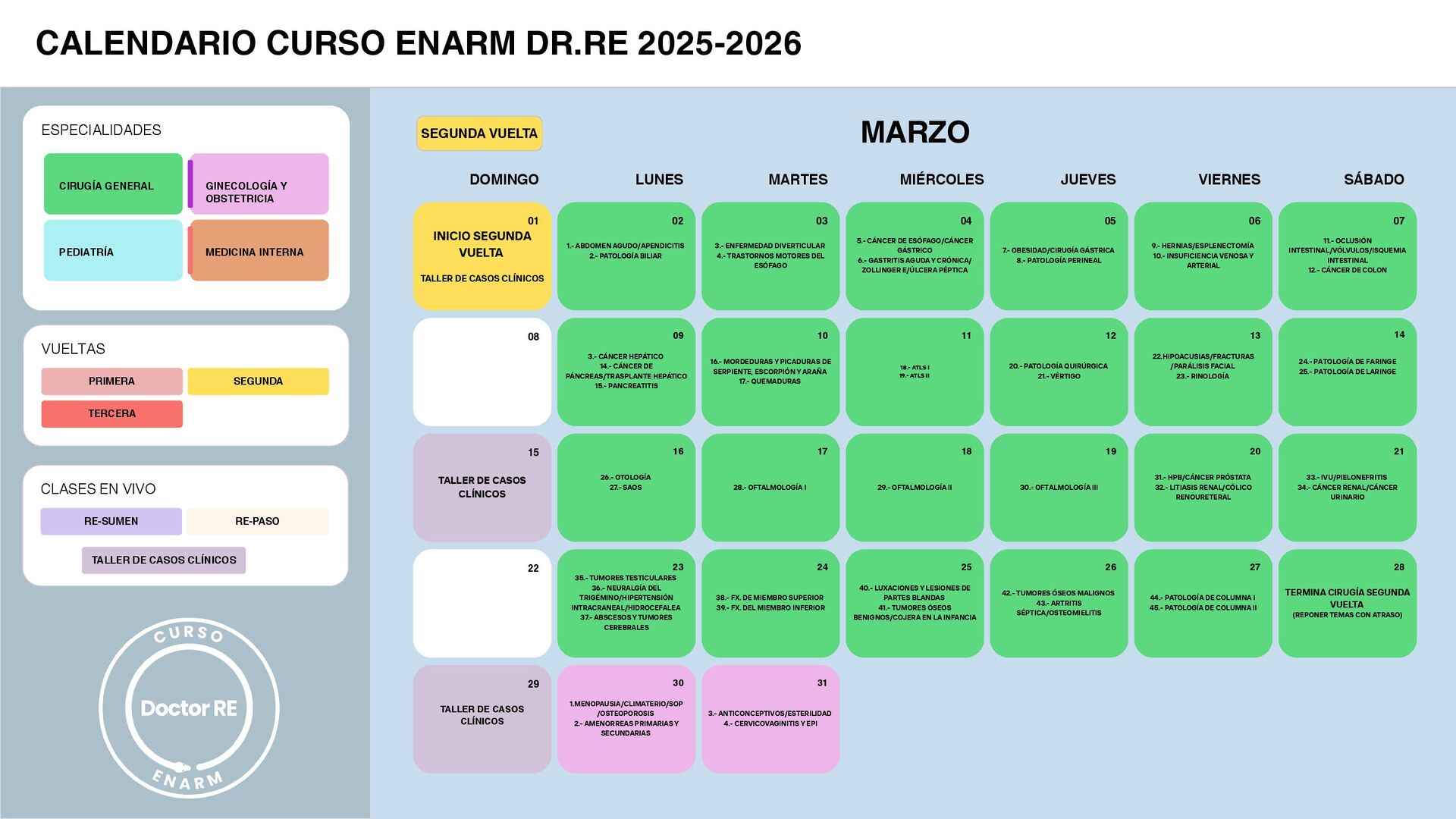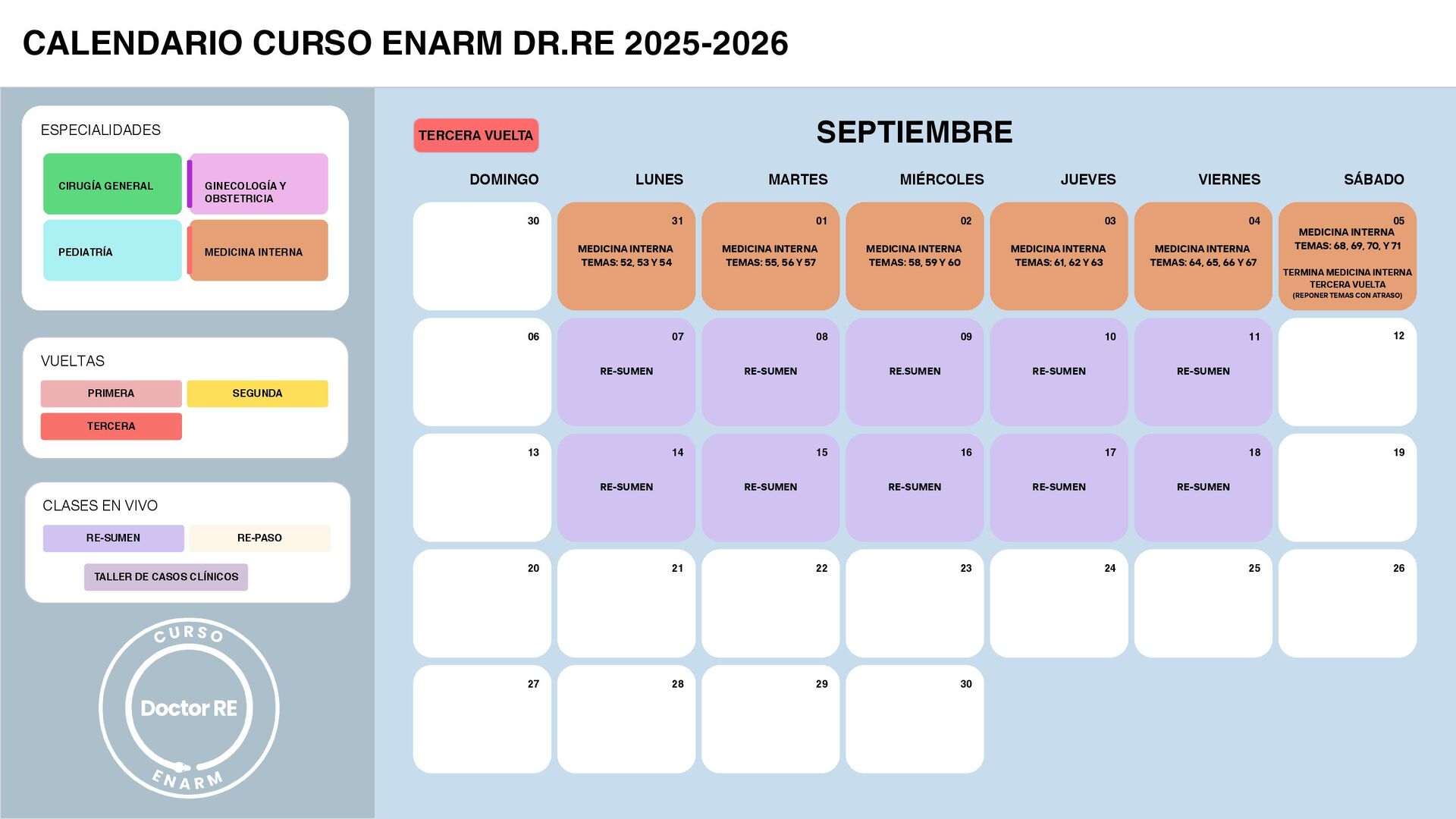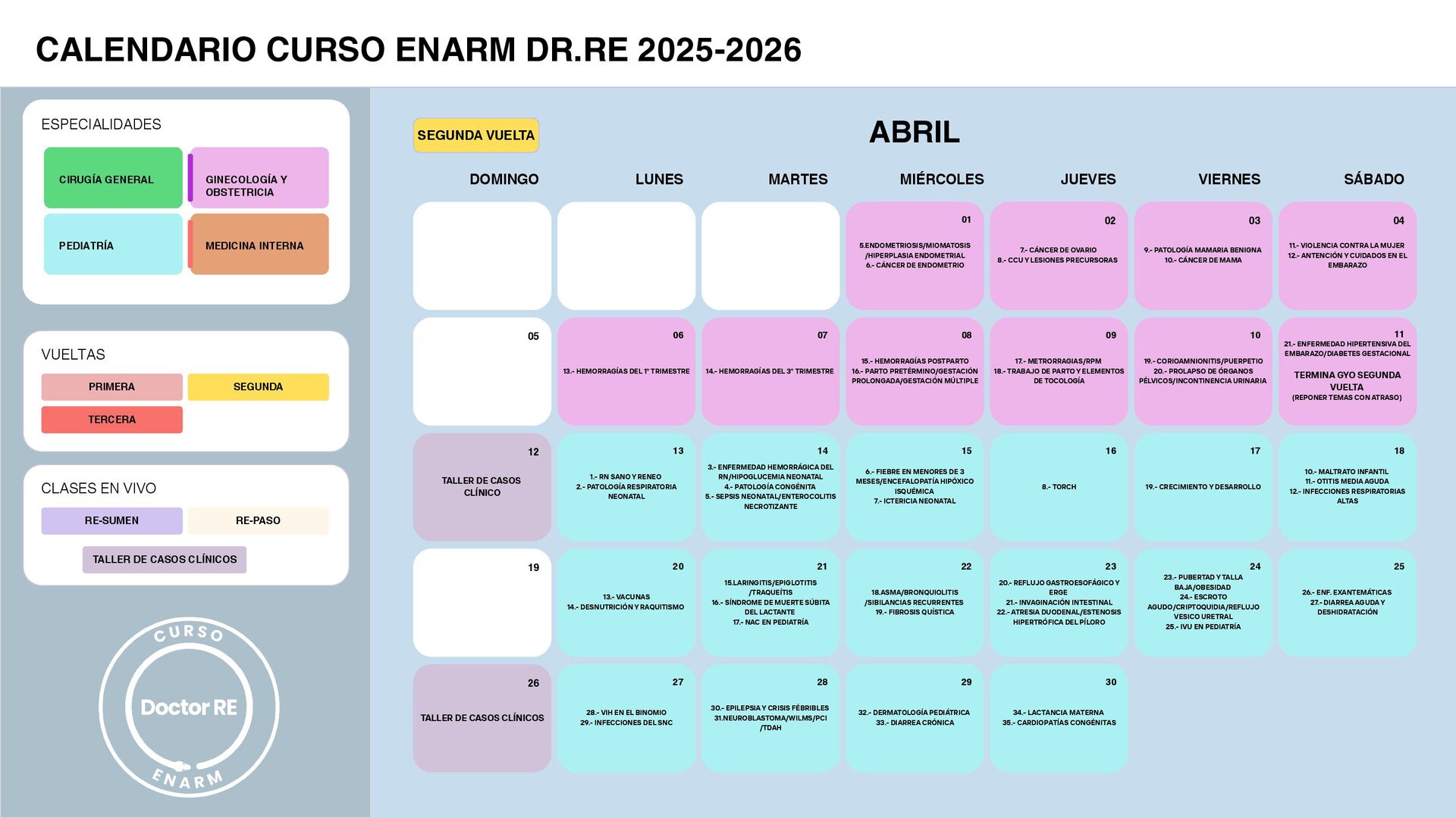 JUEVES MIÉRCOLES JULIO MARTES LUNES DOMINGO 05 12 19 26 PRIMERA SEGUNDA TERCERA VUELTAS ESPECIALIDADES CIRUGÍA GENERAL GINECOLOGÍA Y OBSTETRICIA PEDIATRÍA MEDICINA INTERNA CALENDARIO CURSO ENARM DR.RE 2025-2026 RE-SUMEN RE-PASO CLASES EN VIVO TALLER DE CASOS CLÍNICOS TERCERA VUELTA CIRUGÍA TEMAS: 16, 17 Y 18 CIRUGÍA TEMAS: 13, 14 Y 15 CIRUGÍA TEMAS: 10, 11 Y 12 CIRUGÍA TEMAS: 7, 8 Y 9 04 03 02 01 CIRUGÍA TEMAS: 34, 35 Y 36 CIRUGÍA TEMAS: 31, 32 Y 33 CIRUGÍA TEMAS: 28, 29 Y 30 CIRUGÍA TEMAS: 25, 26 Y 27 CIRUGÍA TEMAS: 22, 23 Y 24 CIRUGÍA TEMAS: 19, 20 Y 21 11 10 09 08 07 06 CIRUGÍA TEMAS: 43, 44 Y 45 TERMINA CIRUGÍA TERCERA VUELTA (REPONER TEMAS CON ATRASO) CIRUGÍA TEMAS: 40,41 Y 42 CIRUGÍA TEMAS: 37,38 Y 39 15 14 13 GYO TEMAS: 4, 5 Y 6 GYO TEMAS: 1, 2 Y 3 17 16 GYO TEMAS: 7, 8 Y 9 18 GYO TEMAS: 13, 14 Y 15 GYO TEMAS: 10, 11 Y 12 21 20 GYO TEMAS: 16, 17 Y 18 22 GYO TEMAS: 1, 20 Y 21 TERMINA GYO TERCERA VUELTA (REPONER TEMAS CON ATRASO) 23 PEDIATRÍA TEMAS: 4, 5 Y 6 PEDIATRÍA TEMAS: 1, 2 Y 3 25 24 PEDIATRÍA TEMAS: 13, 14 Y 15 PEDIATRÍA TEMAS: 10, 11 Y 12 PEDIATRÍA TEMAS: 7, 8 Y 9 29 28 27 PEDIATRÍA TEMAS: 19, 20 Y 21 PEDIATRÍA TEMAS: 16, 17 Y 18 31 30