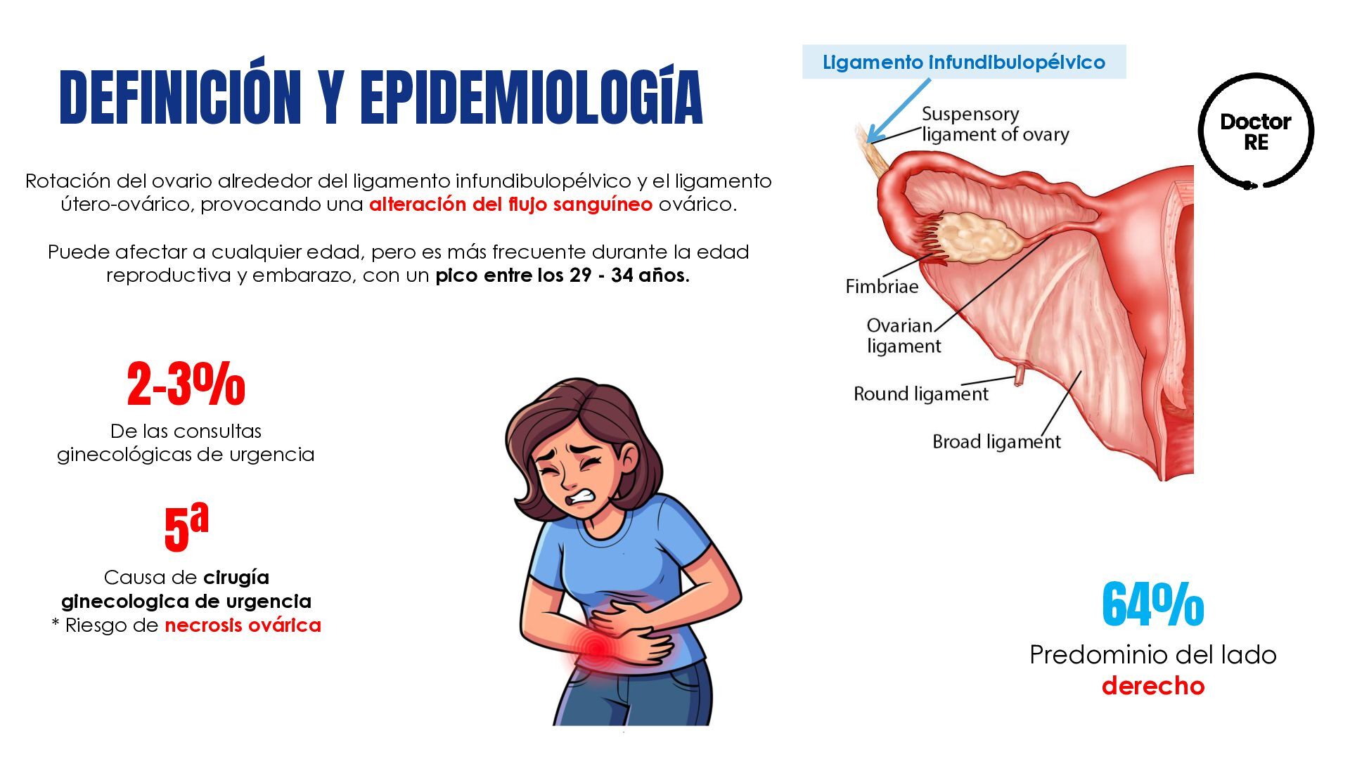 Rotación del ovario alrededor del ligamento infundibulopélvico y el ligamento útero-ovárico, provocando una alteración del flujo sanguíneo ovárico. Puede afectar a cualquier edad, pero es más frecuente durante la edad reproductiva y embarazo, con un pico entre los 29 - 34 años. 5ª Causa de cirugía ginecologica de urgencia * Riesgo de necrosis ovárica 64% Predominio del lado derecho Ligamento infundibulopélvico