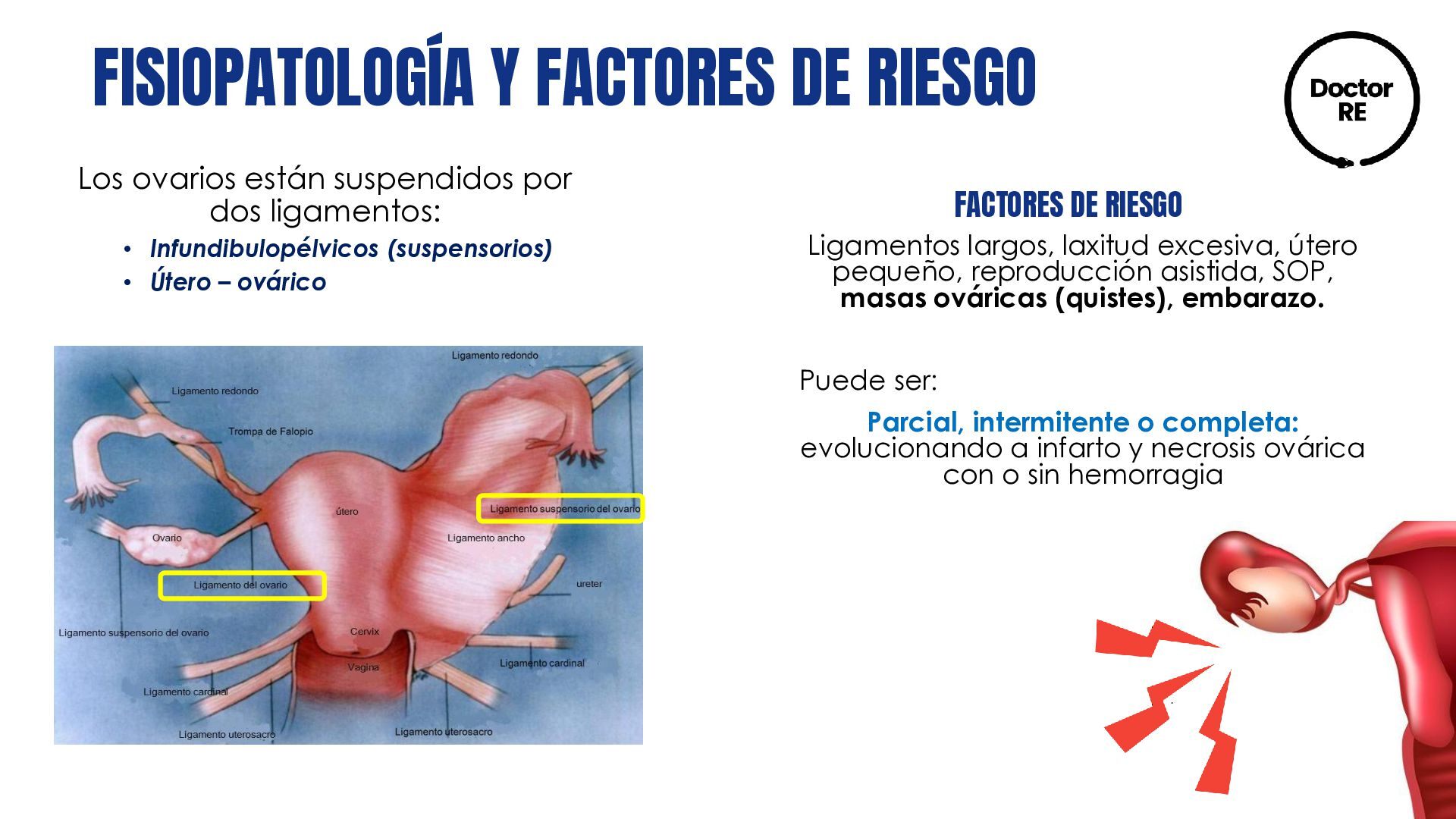 pequeño, reproducción asistida, SOP, masas ováricas (quistes), embarazo. Puede ser: Parcial, intermitente o completa: evolucionando a infarto y necrosis ovárica con o sin hemorragia Los ovarios están suspendidos por dos ligamentos: • Infundibulopélvicos (suspensorios) • Útero – ovárico FACTORES DE RIESGO