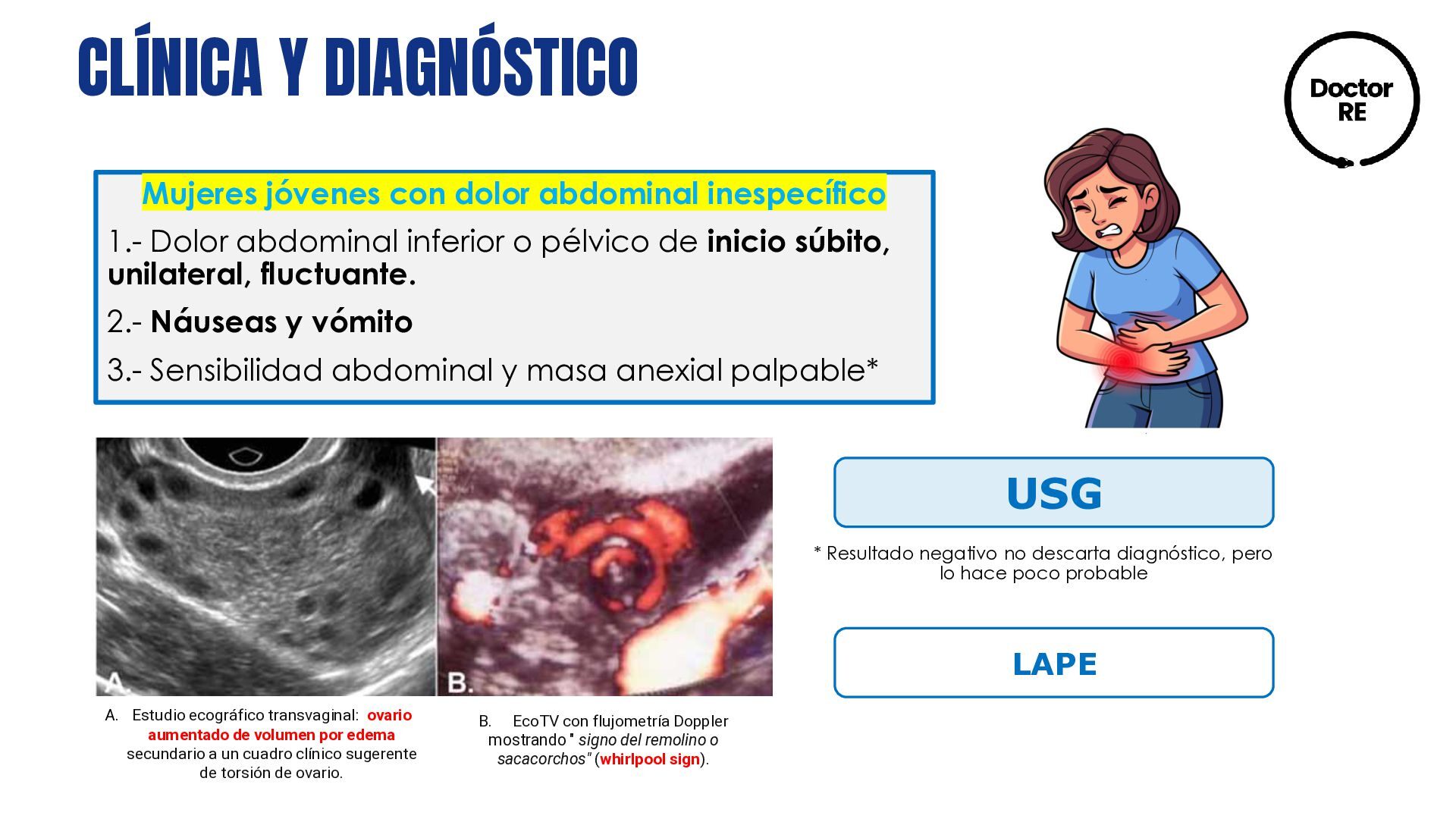 Dolor abdominal inferior o pélvico de inicio súbito, unilateral, fluctuante. 2.- Náuseas y vómito 3.- Sensibilidad abdominal y masa anexial palpable* USG * Resultado negativo no descarta diagnóstico, pero lo hace poco probable LAPE A. Estudio ecográfico transvaginal: ovario aumentado de volumen por edema secundario a un cuadro clínico sugerente de torsión de ovario. B. EcoTV con flujometría Doppler mostrando " signo del remolino o sacacorchos" (whirlpool sign).
