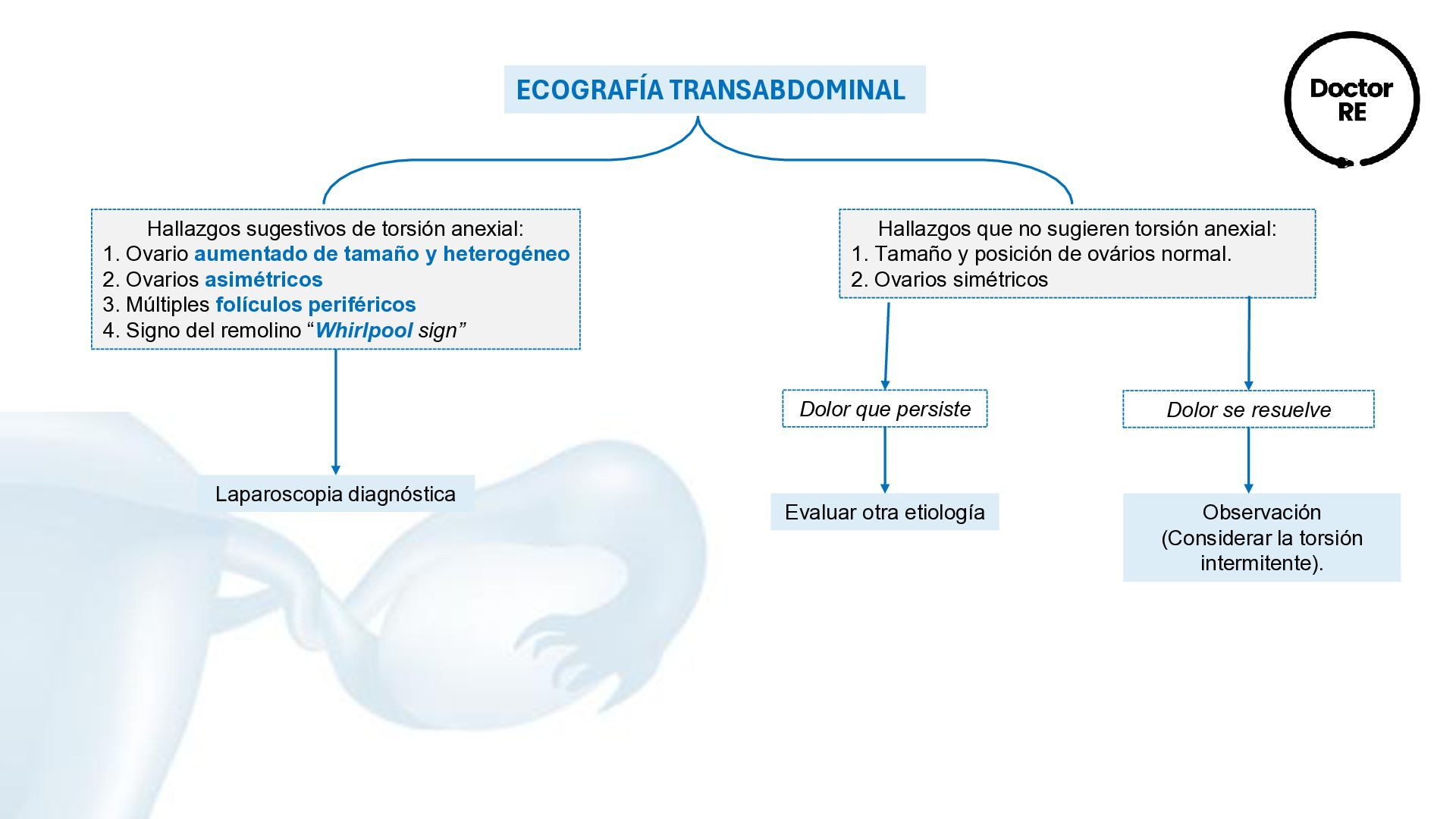 de tamaño y heterogéneo 2. Ovarios asimétricos 3. Múltiples folículos periféricos 4. Signo del remolino “Whirlpool sign” Hallazgos que no sugieren torsión anexial: 1. Tamaño y posición de ovários normal. 2. Ovarios simétricos Laparoscopia diagnóstica Dolor que persiste Dolor se resuelve Evaluar otra etiología Observación (Considerar la torsión intermitente).