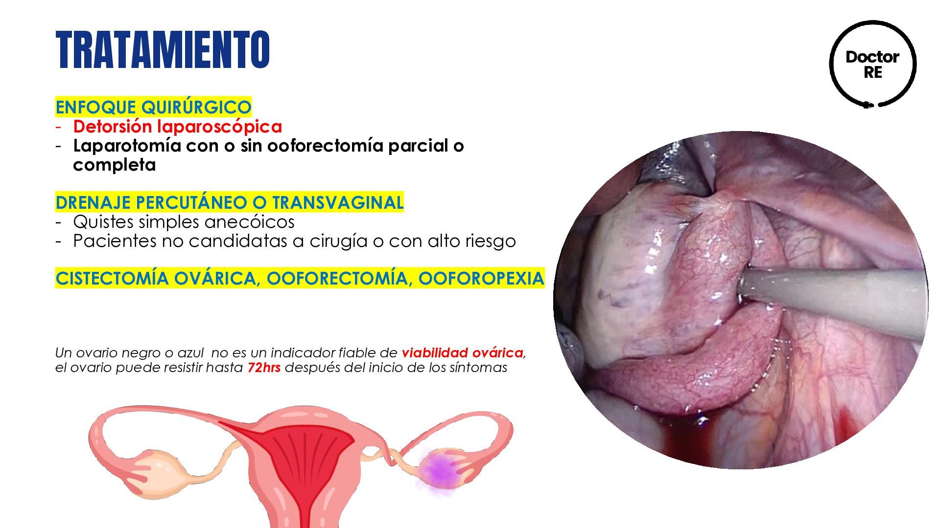 sin ooforectomía parcial o completa DRENAJE PERCUTÁNEO O TRANSVAGINAL - Quistes simples anecóicos - Pacientes no candidatas a cirugía o con alto riesgo CISTECTOMÍA OVÁRICA, OOFORECTOMÍA, OOFOROPEXIA Un ovario negro o azul no es un indicador fiable de viabilidad ovárica, el ovario puede resistir hasta 72hrs después del inicio de los síntomas