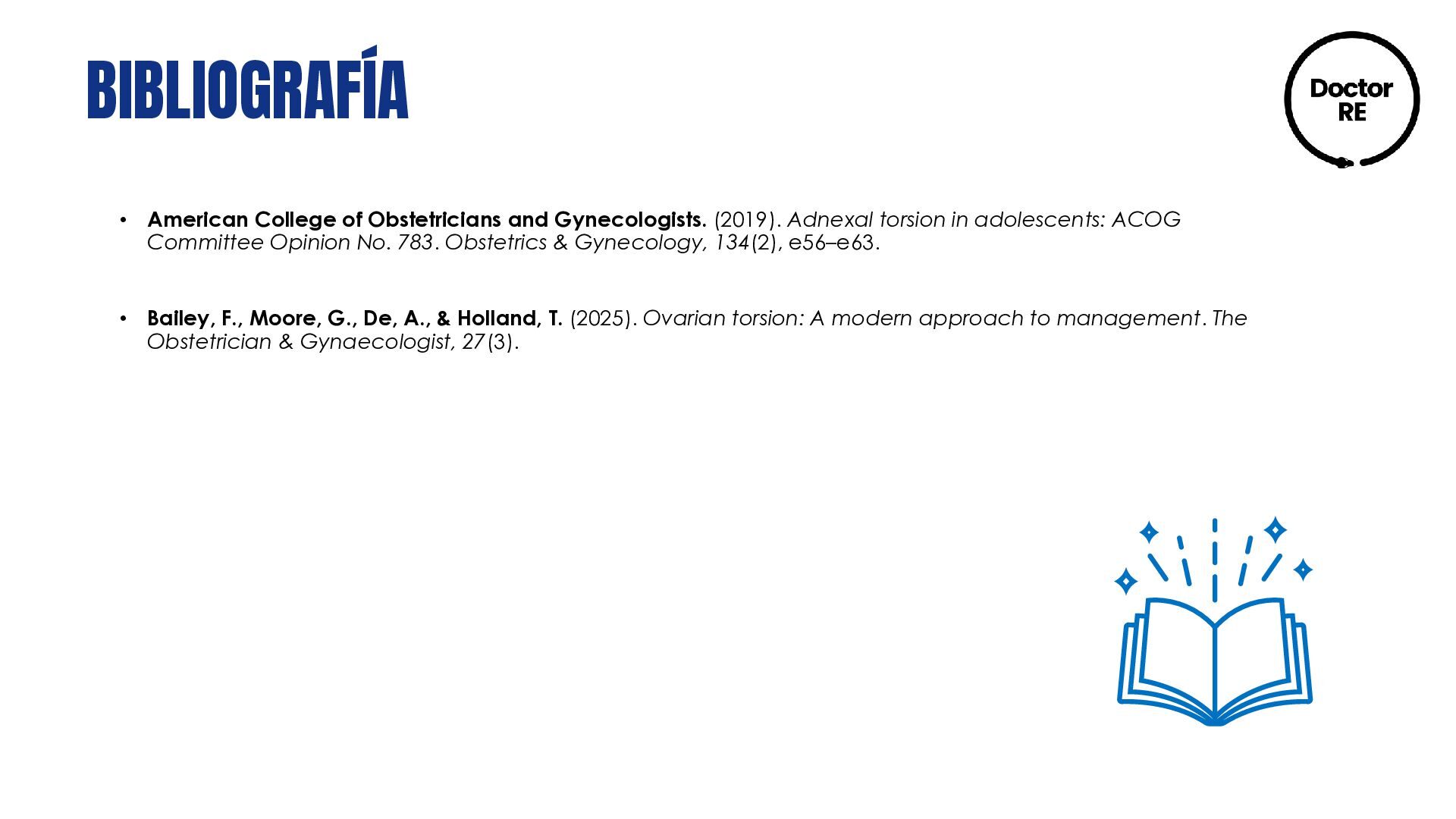 torsion in adolescents: ACOG Committee Opinion No. 783. Obstetrics & Gynecology, 134(2), e56–e63. • Bailey, F., Moore, G., De, A., & Holland, T. (2025). Ovarian torsion: A modern approach to management. The Obstetrician & Gynaecologist, 27(3).