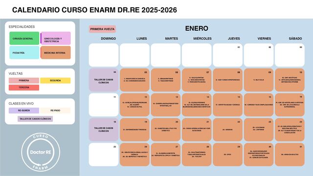 JUEVES MIÉRCOLES JULIO MARTES LUNES DOMINGO 05 12 19 26 PRIMERA SEGUNDA TERCERA VUELTAS ESPECIALIDADES CIRUGÍA GENERAL GINECOLOGÍA Y OBSTETRICIA PEDIATRÍA MEDICINA INTERNA CALENDARIO CURSO ENARM DR.RE 2025-2026 RE-SUMEN RE-PASO CLASES EN VIVO TALLER DE CASOS CLÍNICOS TERCERA VUELTA CIRUGÍA TEMAS: 16, 17 Y 18 CIRUGÍA TEMAS: 13, 14 Y 15 CIRUGÍA TEMAS: 10, 11 Y 12 CIRUGÍA TEMAS: 7, 8 Y 9 04 03 02 01 CIRUGÍA TEMAS: 34, 35 Y 36 CIRUGÍA TEMAS: 31, 32 Y 33 CIRUGÍA TEMAS: 28, 29 Y 30 CIRUGÍA TEMAS: 25, 26 Y 27 CIRUGÍA TEMAS: 22, 23 Y 24 CIRUGÍA TEMAS: 19, 20 Y 21 11 10 09 08 07 06 CIRUGÍA TEMAS: 43, 44 Y 45 TERMINA CIRUGÍA TERCERA VUELTA (REPONER TEMAS CON ATRASO) CIRUGÍA TEMAS: 40,41 Y 42 CIRUGÍA TEMAS: 37,38 Y 39 15 14 13 GYO TEMAS: 4, 5 Y 6 GYO TEMAS: 1, 2 Y 3 17 16 GYO TEMAS: 7, 8 Y 9 18 GYO TEMAS: 13, 14 Y 15 GYO TEMAS: 10, 11 Y 12 21 20 GYO TEMAS: 16, 17 Y 18 22 GYO TEMAS: 1, 20 Y 21 TERMINA GYO TERCERA VUELTA (REPONER TEMAS CON ATRASO) 23 PEDIATRÍA TEMAS: 4, 5 Y 6 PEDIATRÍA TEMAS: 1, 2 Y 3 25 24 PEDIATRÍA TEMAS: 13, 14 Y 15 PEDIATRÍA TEMAS: 10, 11 Y 12 PEDIATRÍA TEMAS: 7, 8 Y 9 29 28 27 PEDIATRÍA TEMAS: 19, 20 Y 21 PEDIATRÍA TEMAS: 16, 17 Y 18 31 30