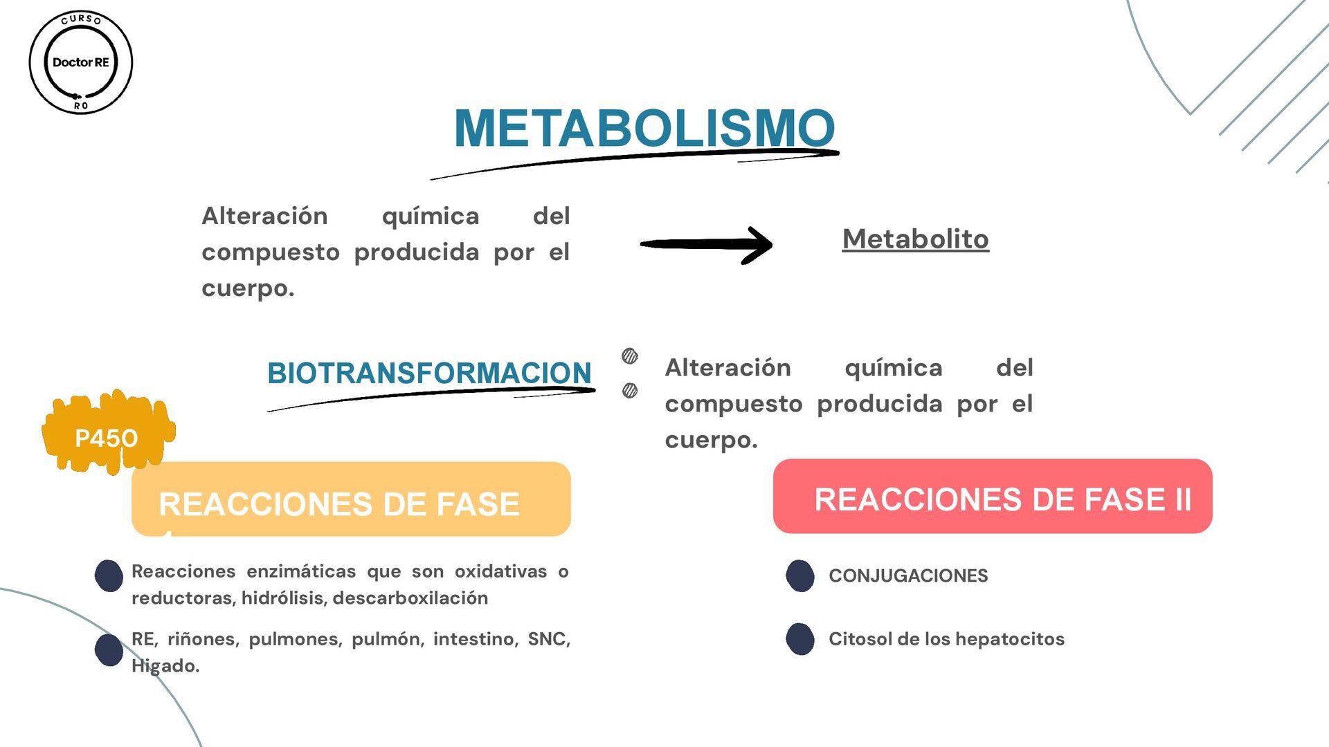 Alteración química del compuesto producida por el cuerpo. Metabolito Alteración química del compuesto producida por el cuerpo. Reacciones enzimáticas que son oxidativas o reductoras, hidrólisis, descarboxilación RE, riñones, pulmones, pulmón, intestino, SNC, Higado. P450 CONJUGACIONES Citosol de los hepatocitos