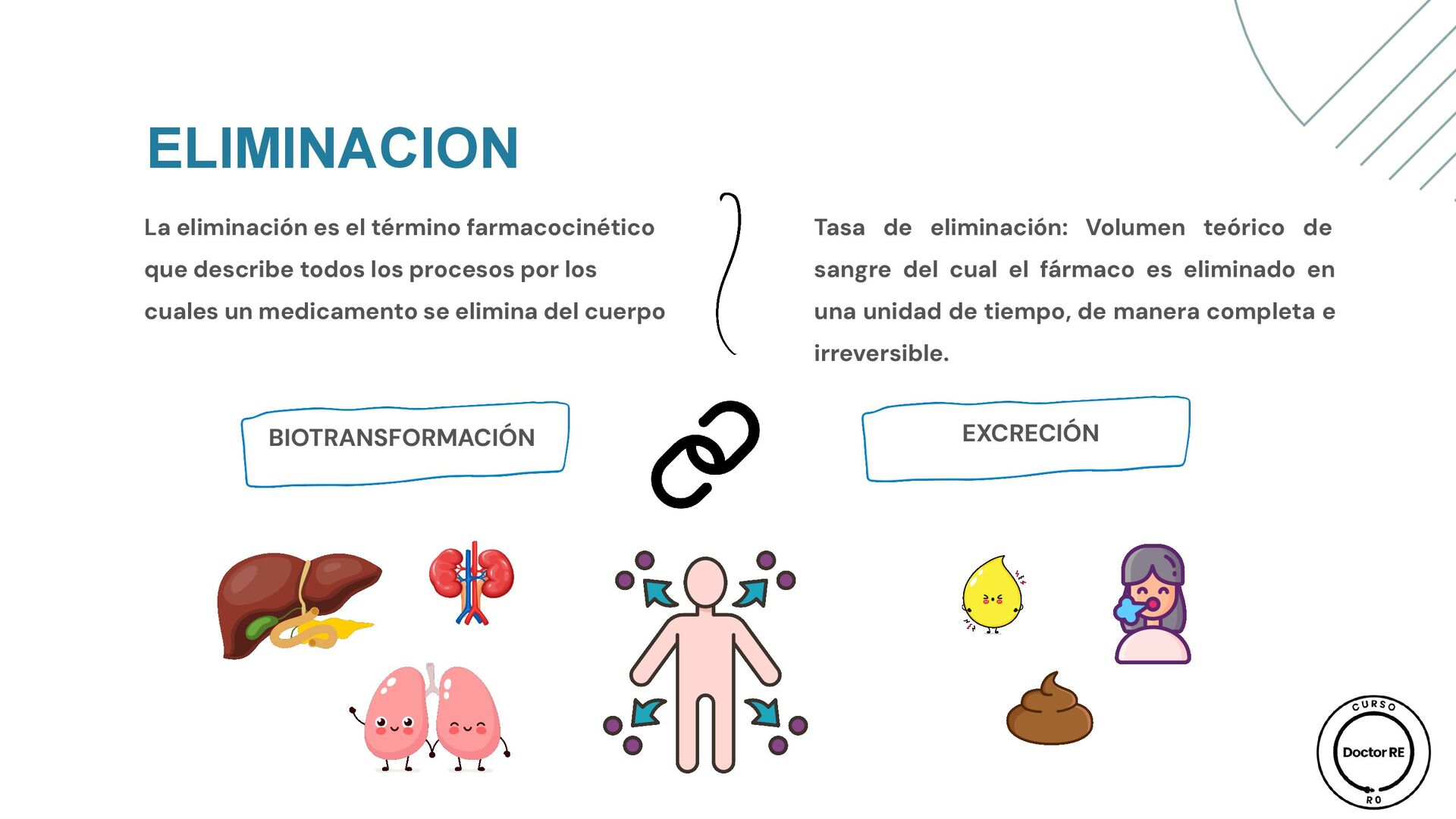 los procesos por los cuales un medicamento se elimina del cuerpo Tasa de eliminación: Volumen teórico de sangre del cual el fármaco es eliminado en una unidad de tiempo, de manera completa e irreversible. BIOTRANSFORMACIÓN EXCRECIÓN