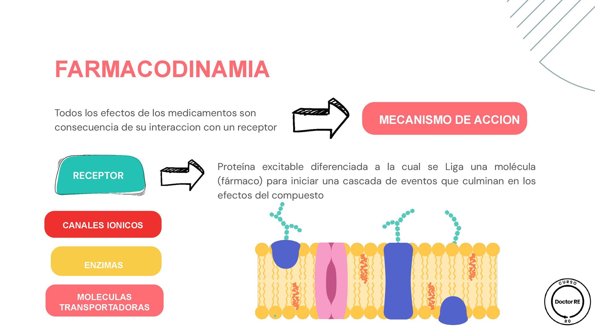 su interaccion con un receptor ENZIMAS MECANISMO DE ACCION CANALES IONICOS RECEPTOR Proteína excitable diferenciada a la cual se Liga una molécula (fármaco) para iniciar una cascada de eventos que culminan en los efectos del compuesto MOLECULAS TRANSPORTADORAS
