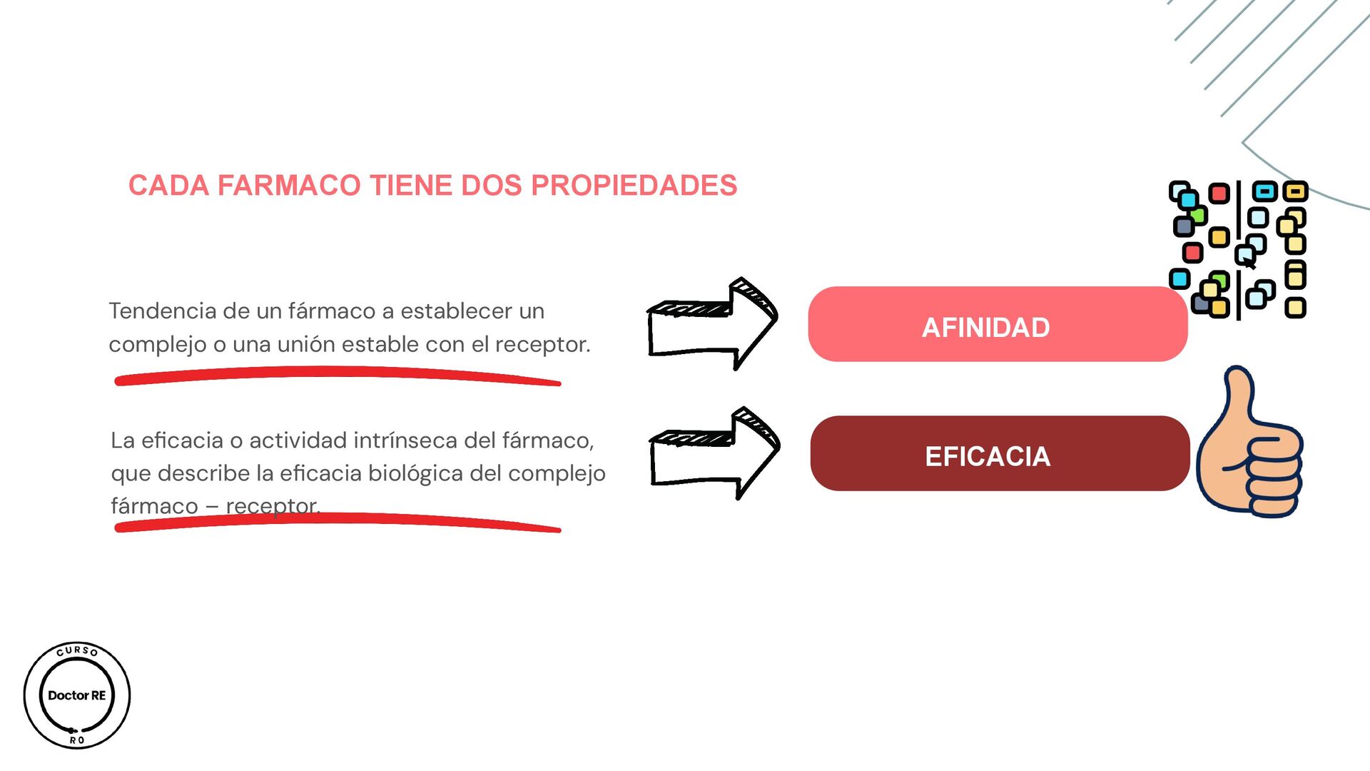 establecer un complejo o una unión estable con el receptor. AFINIDAD La eficacia o actividad intrínseca del fármaco, que describe la eficacia biológica del complejo fármaco – receptor. EFICACIA