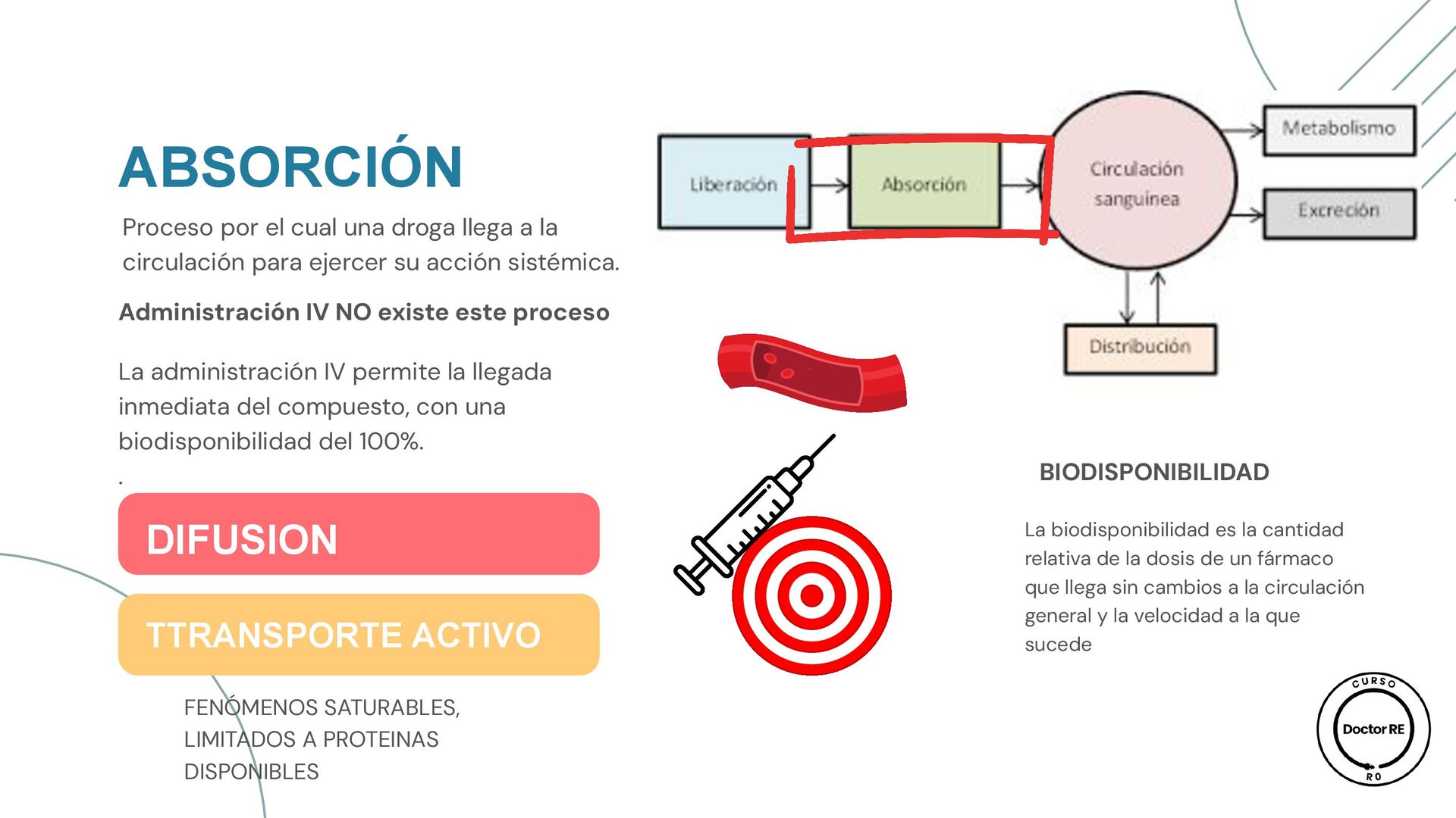 Proceso por el cual una droga llega a la circulación para ejercer su acción sistémica. La administración IV permite la llegada inmediata del compuesto, con una biodisponibilidad del 100%. . BIODISPONIBILIDAD La biodisponibilidad es la cantidad relativa de la dosis de un fármaco que llega sin cambios a la circulación general y la velocidad a la que sucede FENÓMENOS SATURABLES, LIMITADOS A PROTEINAS DISPONIBLES