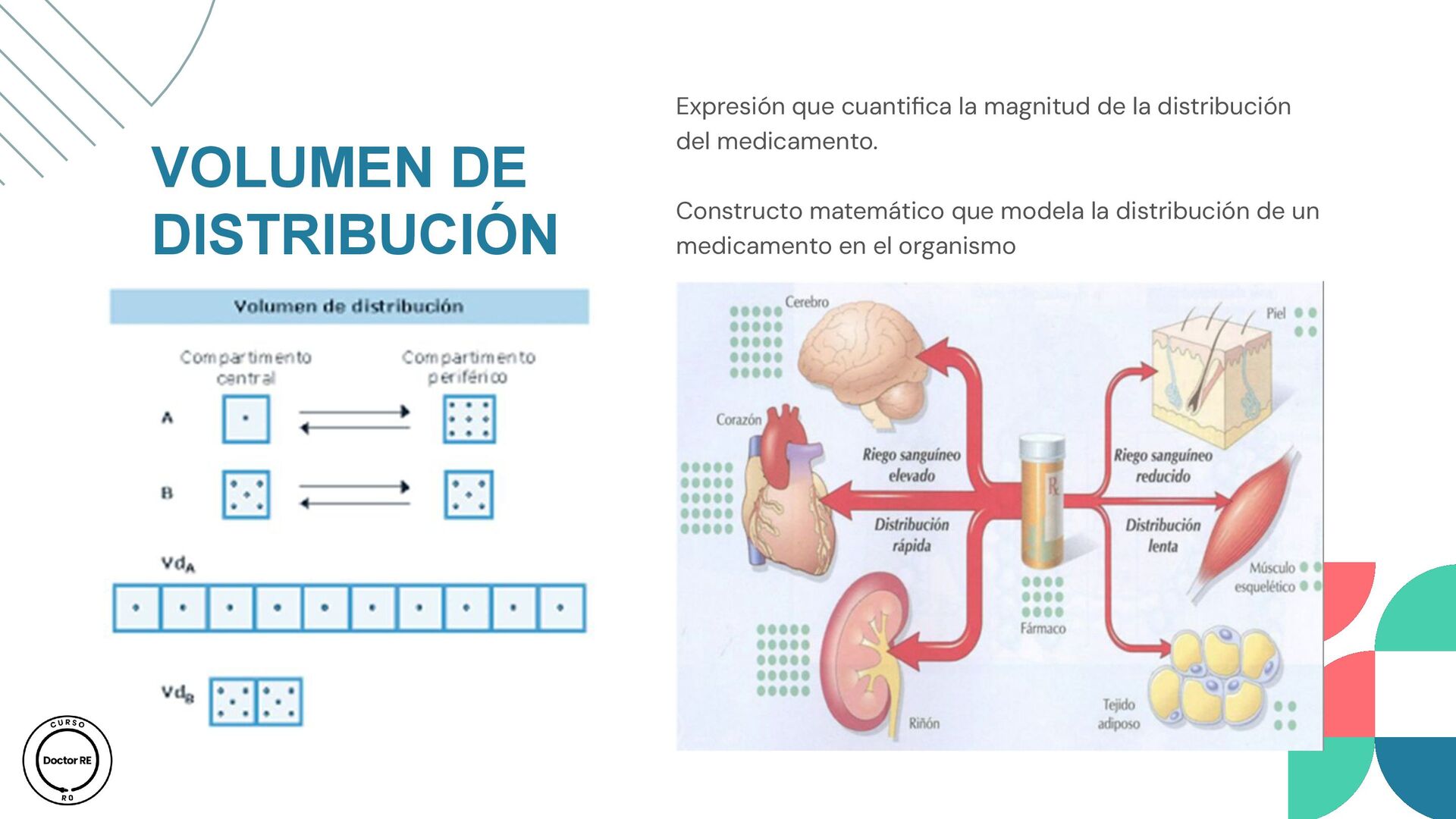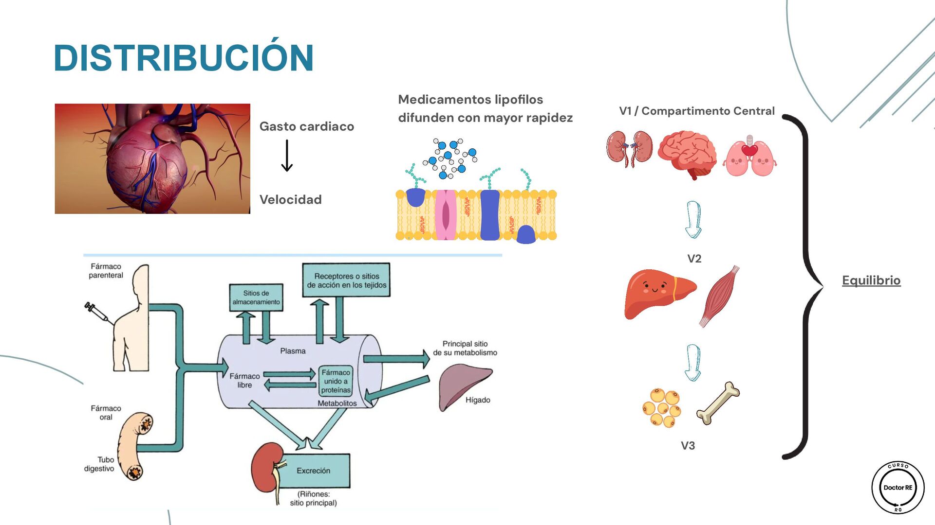 distribución del medicamento. Constructo matemático que modela la distribución de un medicamento en el organismo