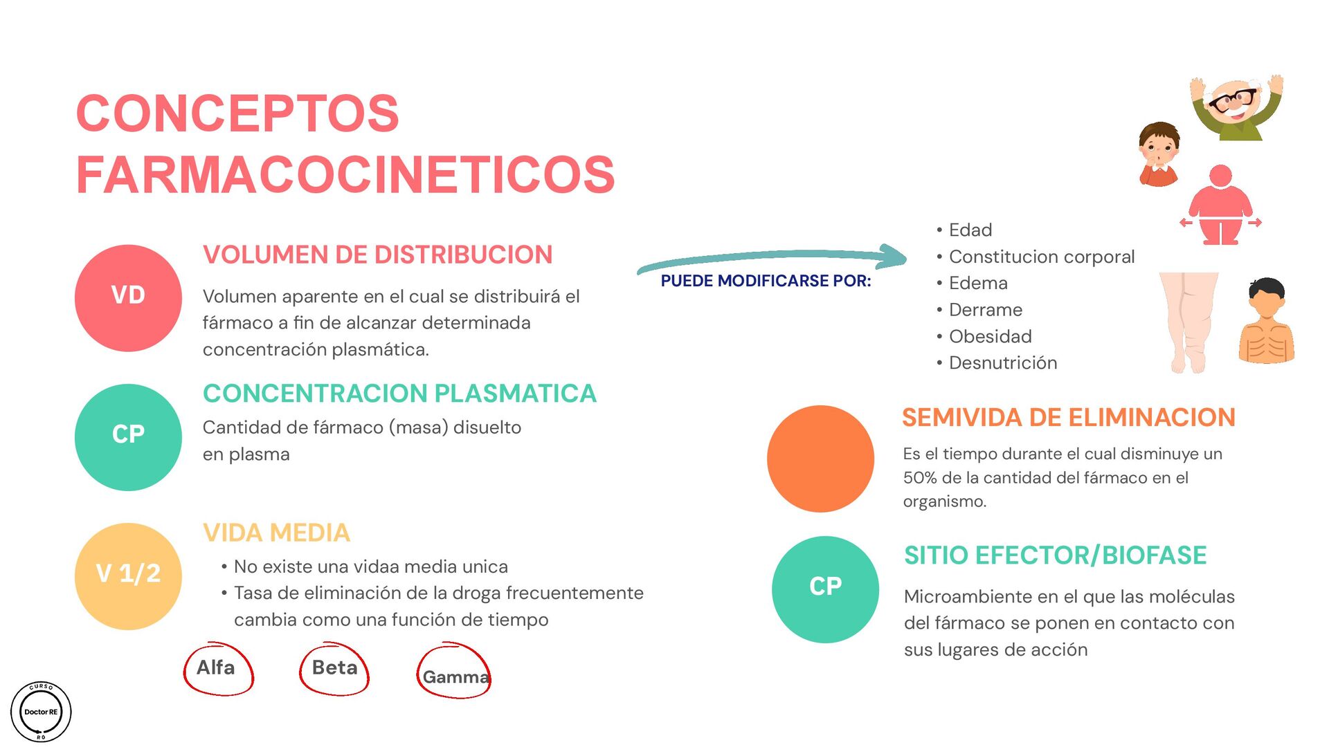 eliminación de la droga frecuentemente cambia como una función de tiempo VD CP CONCEPTOS FARMACOCINETICOS Volumen aparente en el cual se distribuirá el fármaco a fin de alcanzar determinada concentración plasmática. CONCENTRACION PLASMATICA Cantidad de fármaco (masa) disuelto en plasma VIDA MEDIA V 1/2 Alfa Beta Gamma SEMIVIDA DE ELIMINACION Es el tiempo durante el cual disminuye un 50% de la cantidad del fármaco en el organismo. VOLUMEN DE DISTRIBUCION PUEDE MODIFICARSE POR: • Edad • Constitucion corporal • Edema • Derrame • Obesidad • Desnutrición CP Microambiente en el que las moléculas del fármaco se ponen en contacto con sus lugares de acción SITIO EFECTOR/BIOFASE