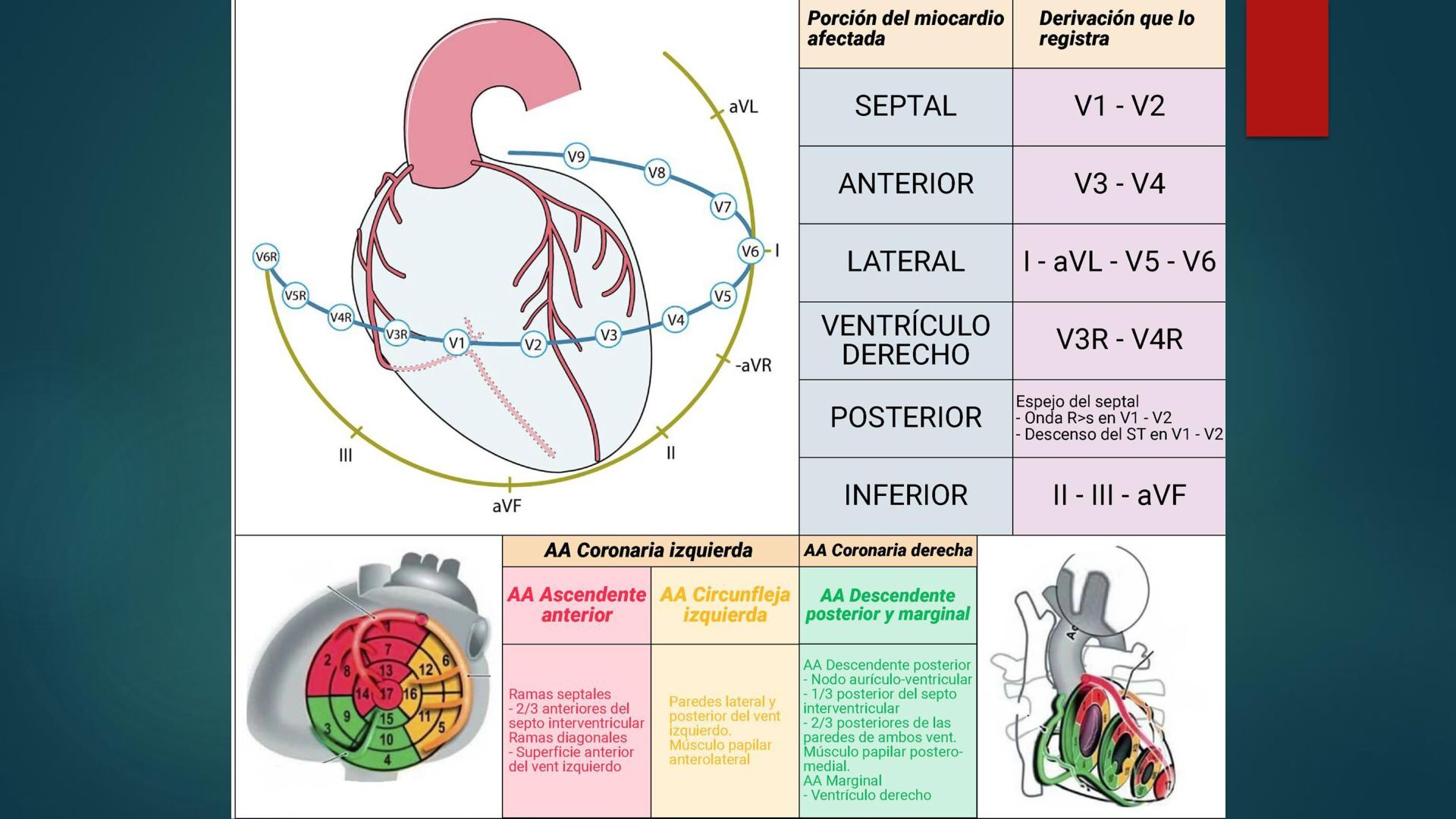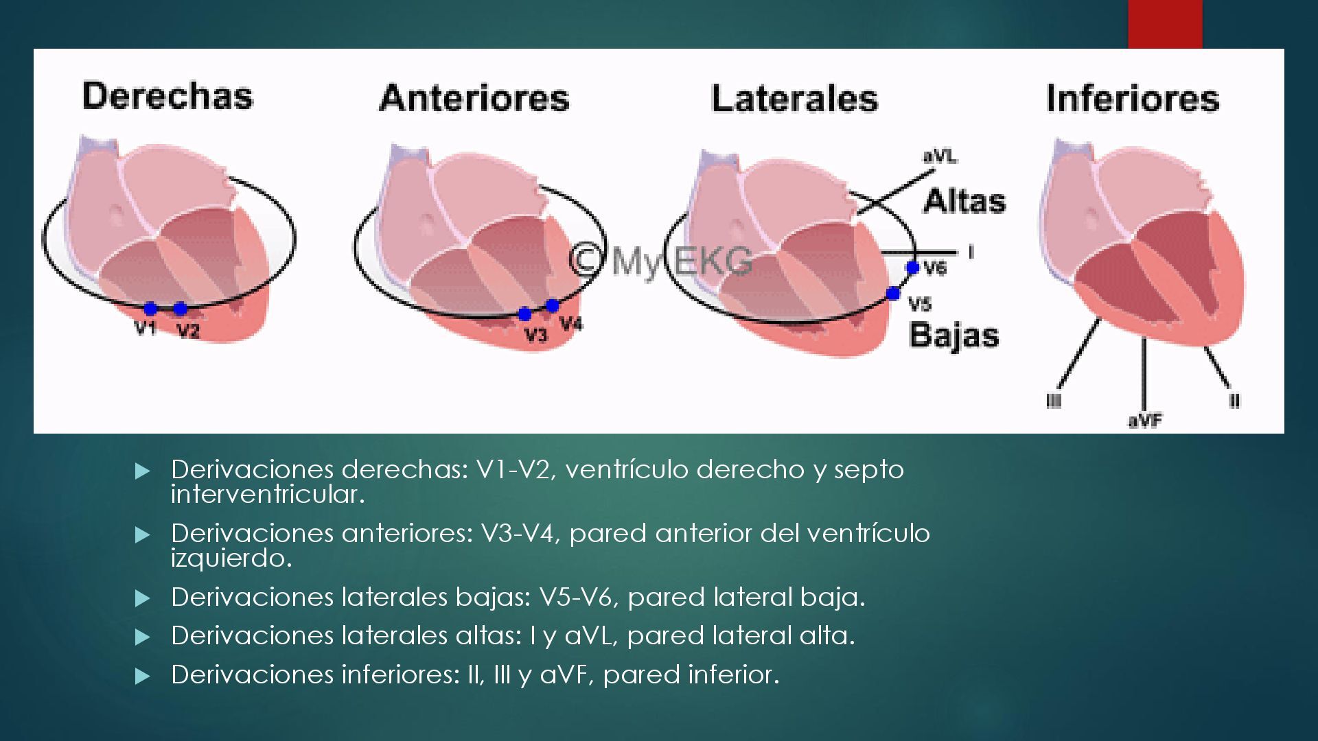 Derivaciones anteriores: V3-V4, pared anterior del ventrículo izquierdo. Derivaciones laterales bajas: V5-V6, pared lateral baja. Derivaciones laterales altas: I y aVL, pared lateral alta. Derivaciones inferiores: II, III y aVF, pared inferior.