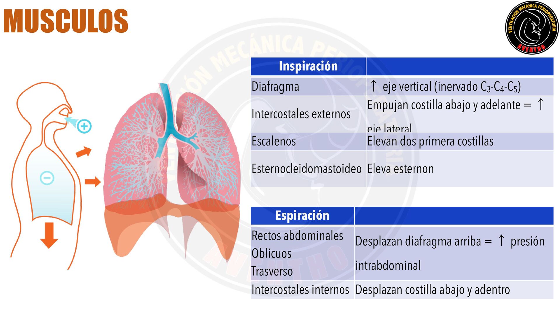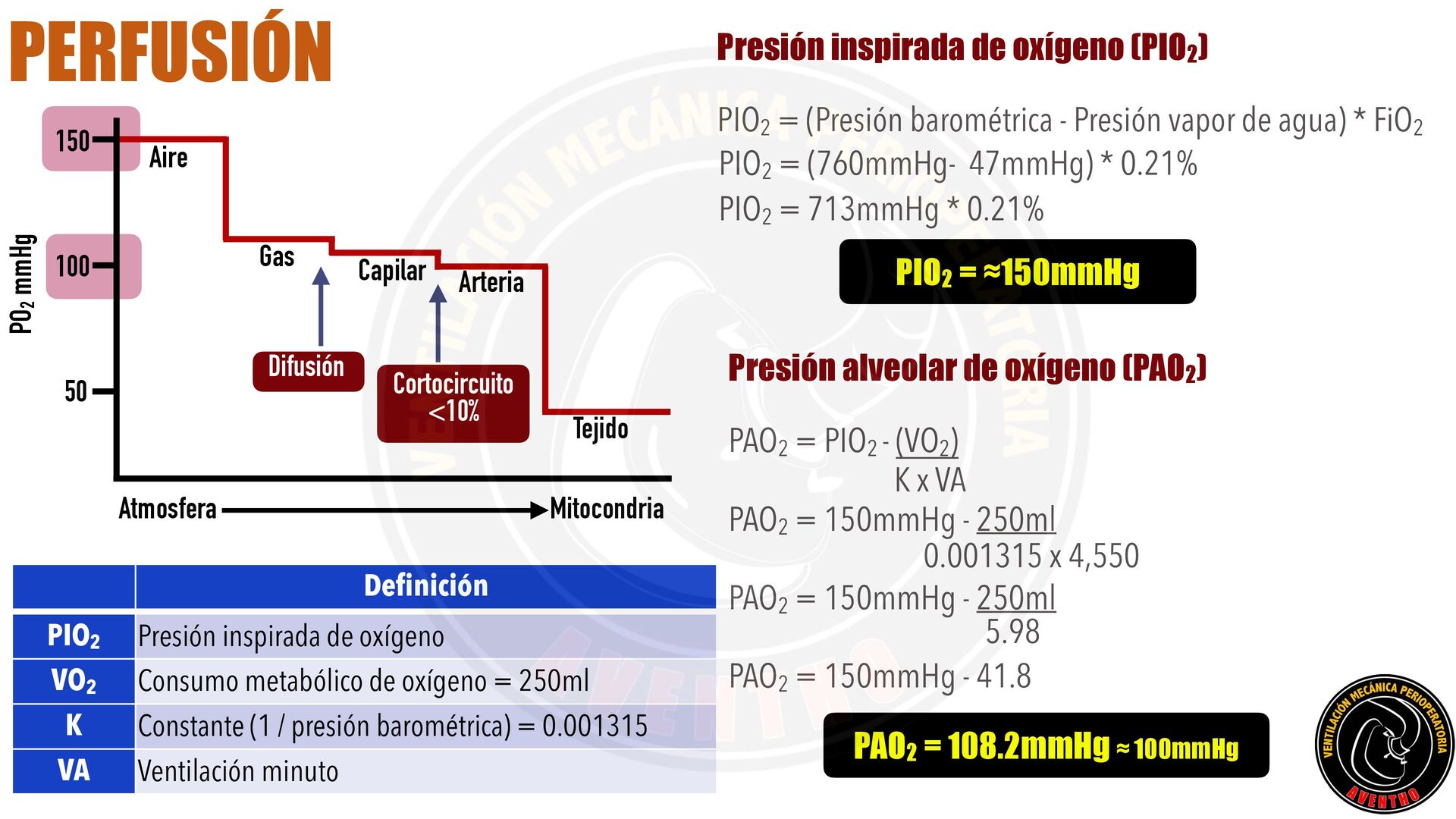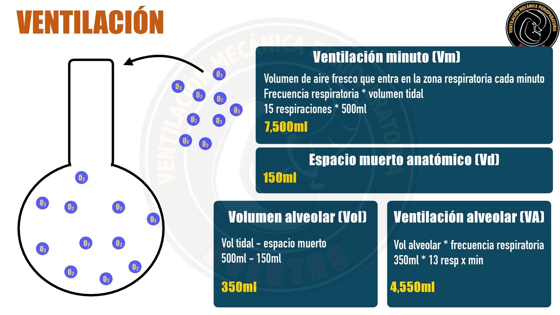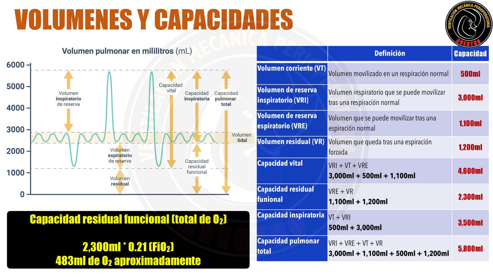 en un respiración normal 500ml Volumen de reserva inspiratorio (VRI) Volumen inspiratorio que se puede movilizar tras una respiración normal 3,000ml Volumen de reserva espiratorio (VRE) Volumen que se puede movilizar tras una espiración normal 1,100ml Volumen residual (VR) Volumen que queda tras una espiración forzada 1,200ml Capacidad vital VRI + VT + VRE 3,000ml + 500ml + 1,100ml 4,600ml Capacidad residual funional VRE + VR 1,100ml + 1,200ml 2,300ml Capacidad inspiratoria VT + VRI 500ml + 3,000ml 3,500ml Capacidad pulmonar total VRI + VRE + VT + VR 3,000ml + 1,100ml + 500ml + 1,200ml 5,800ml Capacidad residual funcional (total de O2 ) 2,300ml * 0.21 (FiO2 ) 483ml de O2 aproximadamente