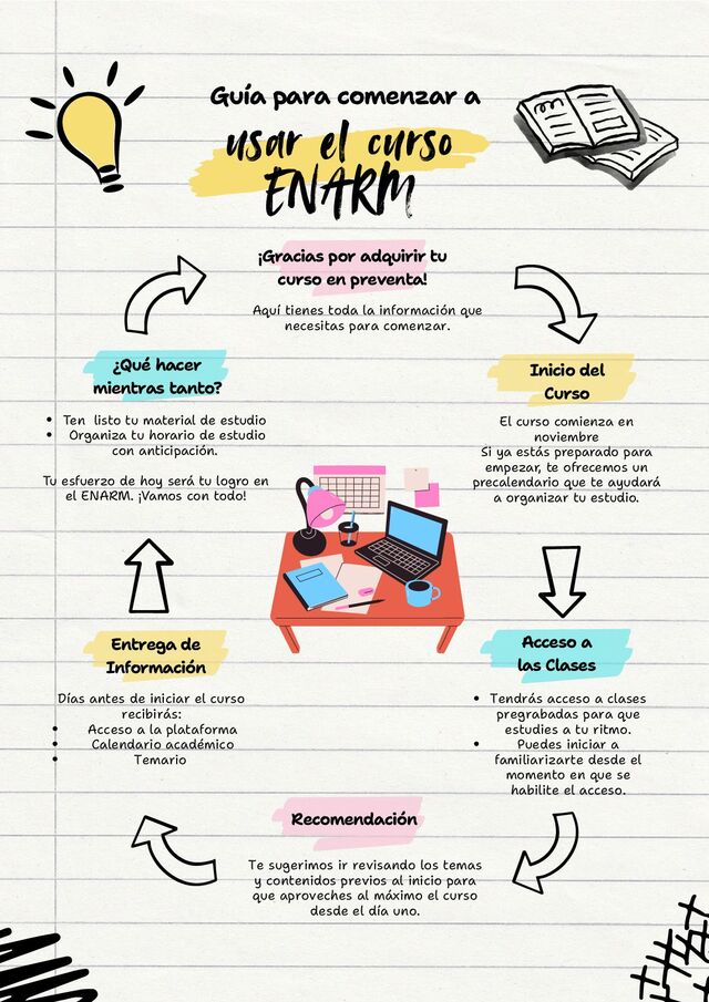 Información Acceso a las Clases Inicio del Curso Ten listo tu material de estudio Organiza tu horario de estudio con anticipación. Tu esfuerzo de hoy será tu logro en el ENARM. ¡Vamos con todo! Días antes de iniciar el curso recibirás: Acceso a la plataforma Calendario académico Temario Tendrás acceso a clases pregrabadas para que estudies a tu ritmo. Puedes iniciar a familiarizarte desde el momento en que se habilite el acceso. El curso comienza en noviembre Si ya estás preparado para empezar, te ofrecemos un precalendario que te ayudará a organizar tu estudio. Te sugerimos ir revisando los temas y contenidos previos al inicio para que aproveches al máximo el curso desde el día uno. Recomendación Aquí tienes toda la información que necesitas para comenzar. ¡Gracias por adquirir tu curso en preventa! usar el curso ENARM