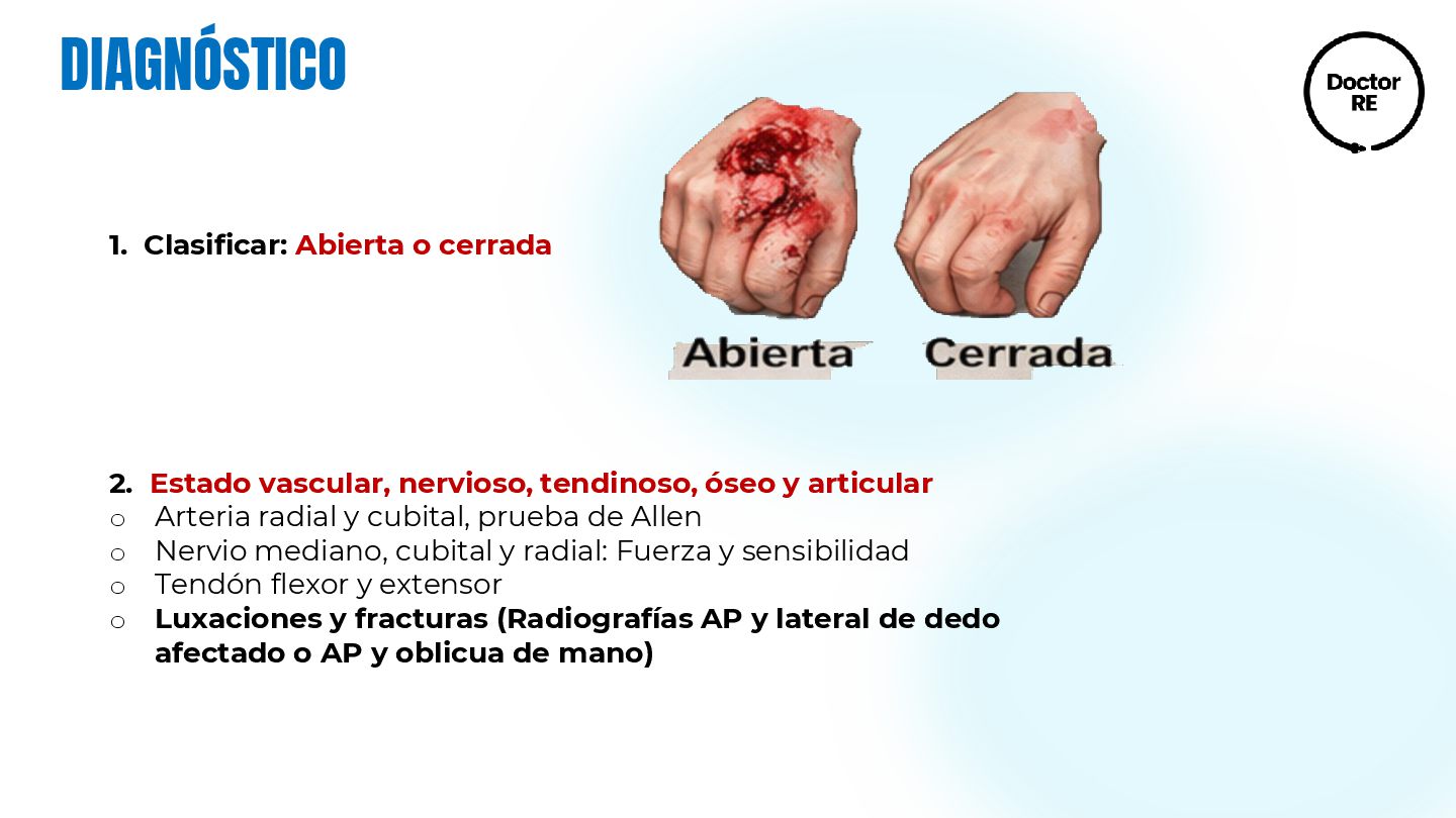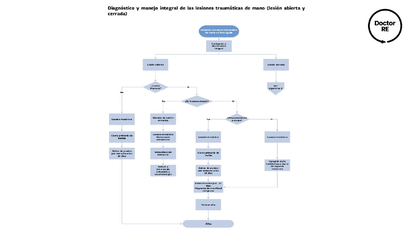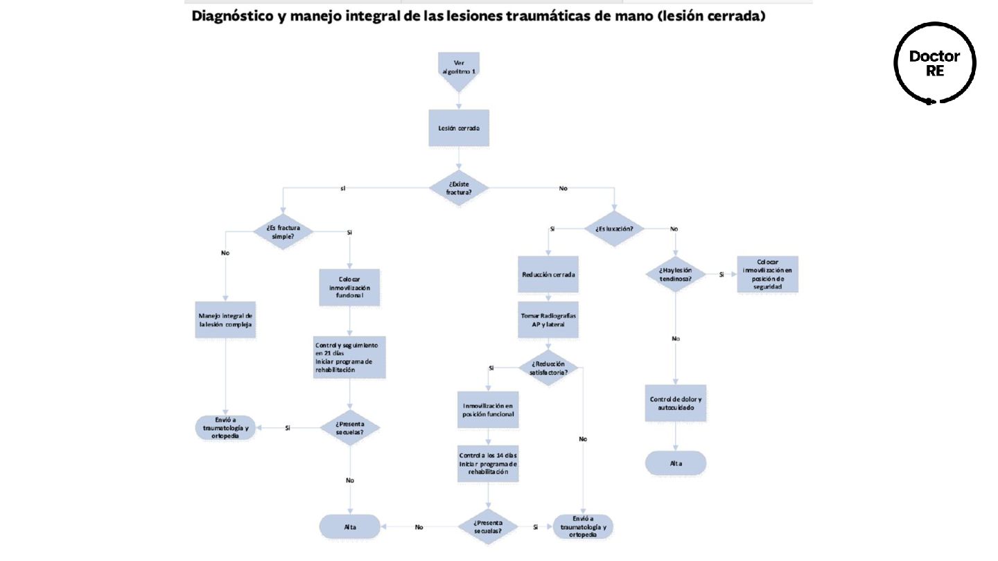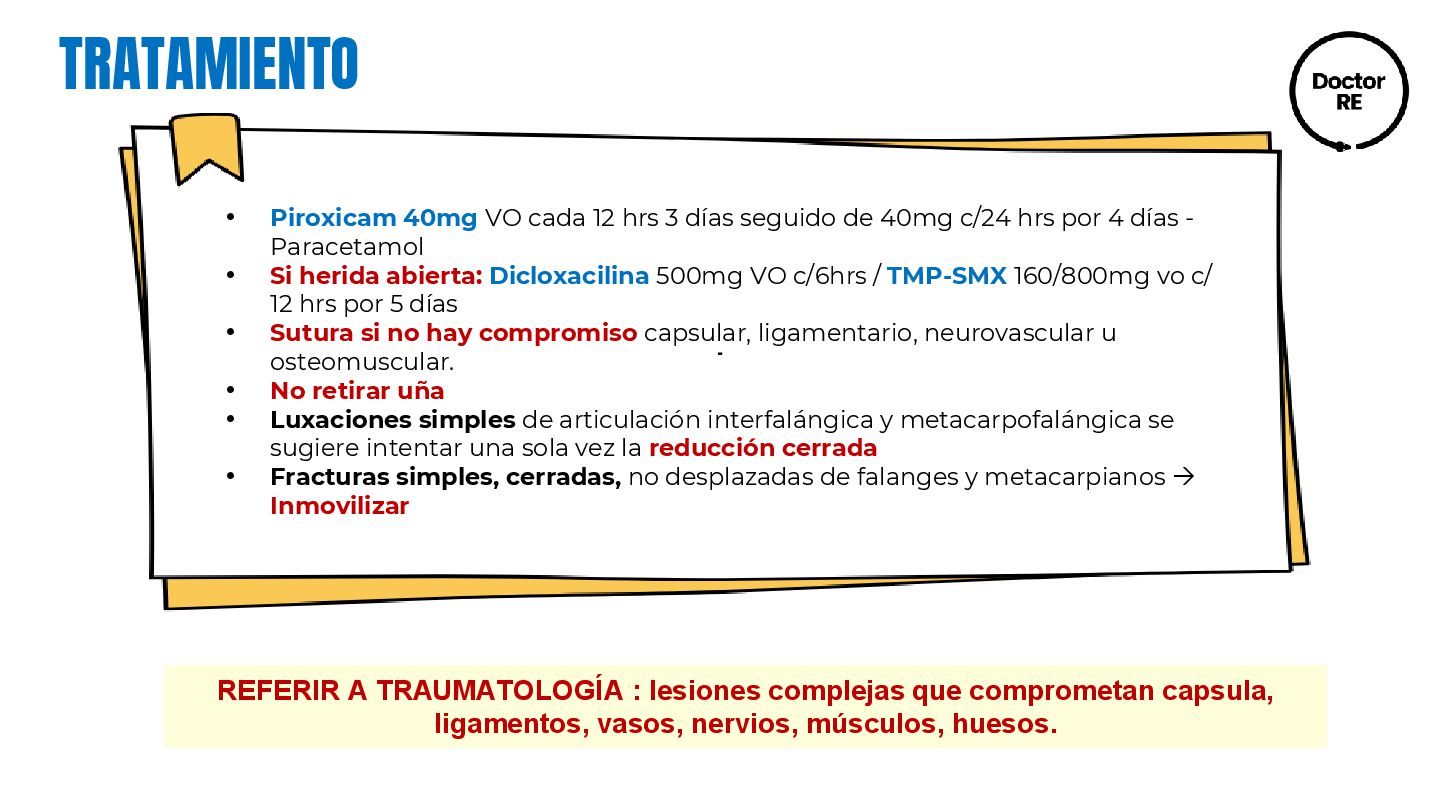 seguido de 40mg c/24 hrs por 4 días - Paracetamol • Si herida abierta: Dicloxacilina 500mg VO c/6hrs / TMP-SMX 160/800mg vo c/ 12 hrs por 5 días • Sutura si no hay compromiso capsular, ligamentario, neurovascular u osteomuscular. • No retirar uña • Luxaciones simples de articulación interfalángica y metacarpofalángica se sugiere intentar una sola vez la reducción cerrada • Fracturas simples, cerradas, no desplazadas de falanges y metacarpianos → Inmovilizar REFERIR A TRAUMATOLOGÍA : lesiones complejas que comprometan capsula, ligamentos, vasos, nervios, músculos, huesos.