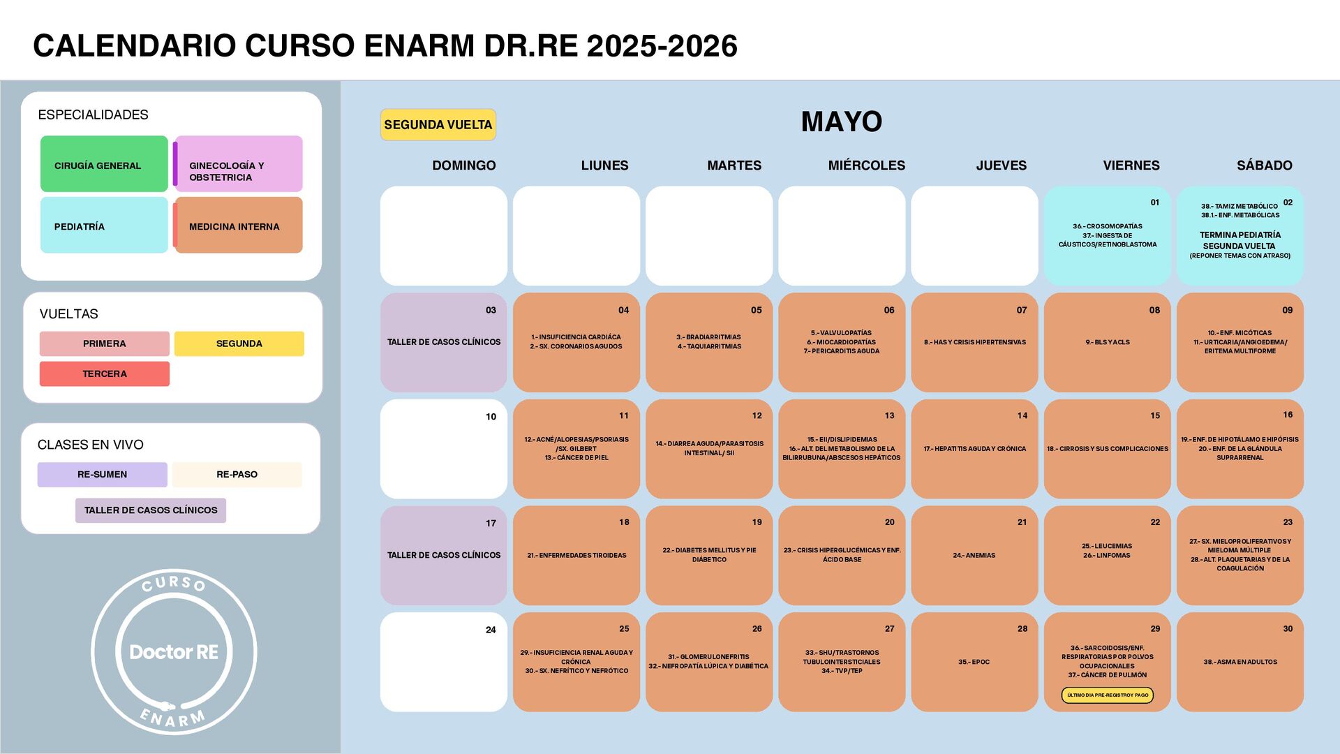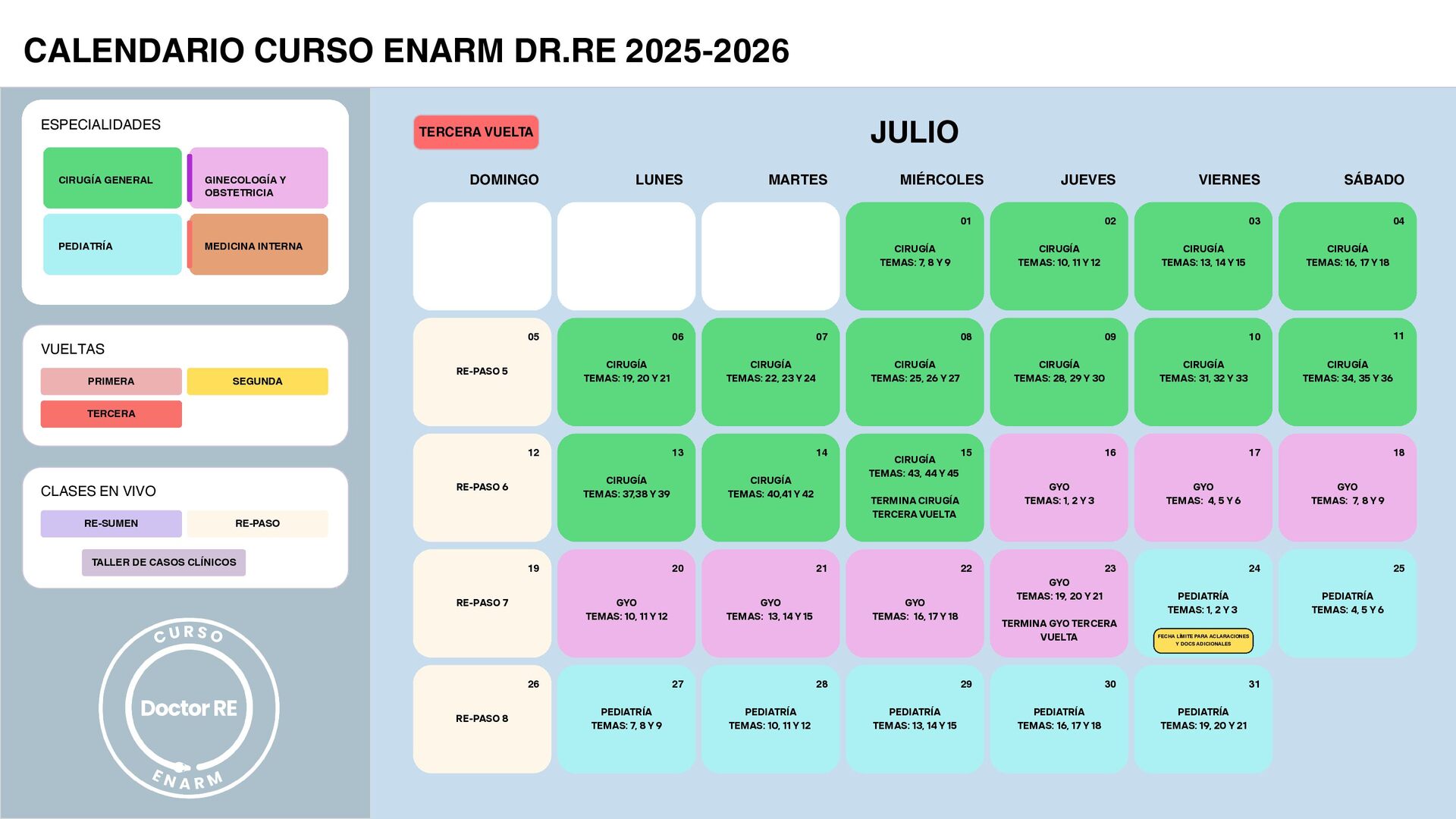 JUEVES MIÉRCOLES JULIO MARTES LUNES DOMINGO 05 12 19 26 PRIMERA SEGUNDA TERCERA VUELTAS ESPECIALIDADES CIRUGÍA GENERAL GINECOLOGÍA Y OBSTETRICIA PEDIATRÍA MEDICINA INTERNA CALENDARIO CURSO ENARM DR.RE 2025-2026 RE-SUMEN RE-PASO CLASES EN VIVO TALLER DE CASOS CLÍNICOS TERCERA VUELTA CIRUGÍA TEMAS: 16, 17 Y 18 CIRUGÍA TEMAS: 13, 14 Y 15 CIRUGÍA TEMAS: 10, 11 Y 12 CIRUGÍA TEMAS: 7, 8 Y 9 04 03 02 01 CIRUGÍA TEMAS: 34, 35 Y 36 CIRUGÍA TEMAS: 31, 32 Y 33 CIRUGÍA TEMAS: 28, 29 Y 30 CIRUGÍA TEMAS: 25, 26 Y 27 CIRUGÍA TEMAS: 22, 23 Y 24 CIRUGÍA TEMAS: 19, 20 Y 21 11 10 09 08 07 06 CIRUGÍA TEMAS: 43, 44 Y 45 TERMINA CIRUGÍA TERCERA VUELTA CIRUGÍA TEMAS: 40,41 Y 42 CIRUGÍA TEMAS: 37,38 Y 39 15 14 13 GYO TEMAS: 4, 5 Y 6 GYO TEMAS: 1, 2 Y 3 17 16 GYO TEMAS: 7, 8 Y 9 18 GYO TEMAS: 13, 14 Y 15 GYO TEMAS: 10, 11 Y 12 21 20 GYO TEMAS: 16, 17 Y 18 22 GYO TEMAS: 19, 20 Y 21 TERMINA GYO TERCERA VUELTA 23 PEDIATRÍA TEMAS: 4, 5 Y 6 PEDIATRÍA TEMAS: 1, 2 Y 3 25 24 PEDIATRÍA TEMAS: 13, 14 Y 15 PEDIATRÍA TEMAS: 10, 11 Y 12 PEDIATRÍA TEMAS: 7, 8 Y 9 29 28 27 PEDIATRÍA TEMAS: 19, 20 Y 21 PEDIATRÍA TEMAS: 16, 17 Y 18 31 30 FECHA LÍMITE PARA ACLARACIONES Y DOCS ADICIONALES