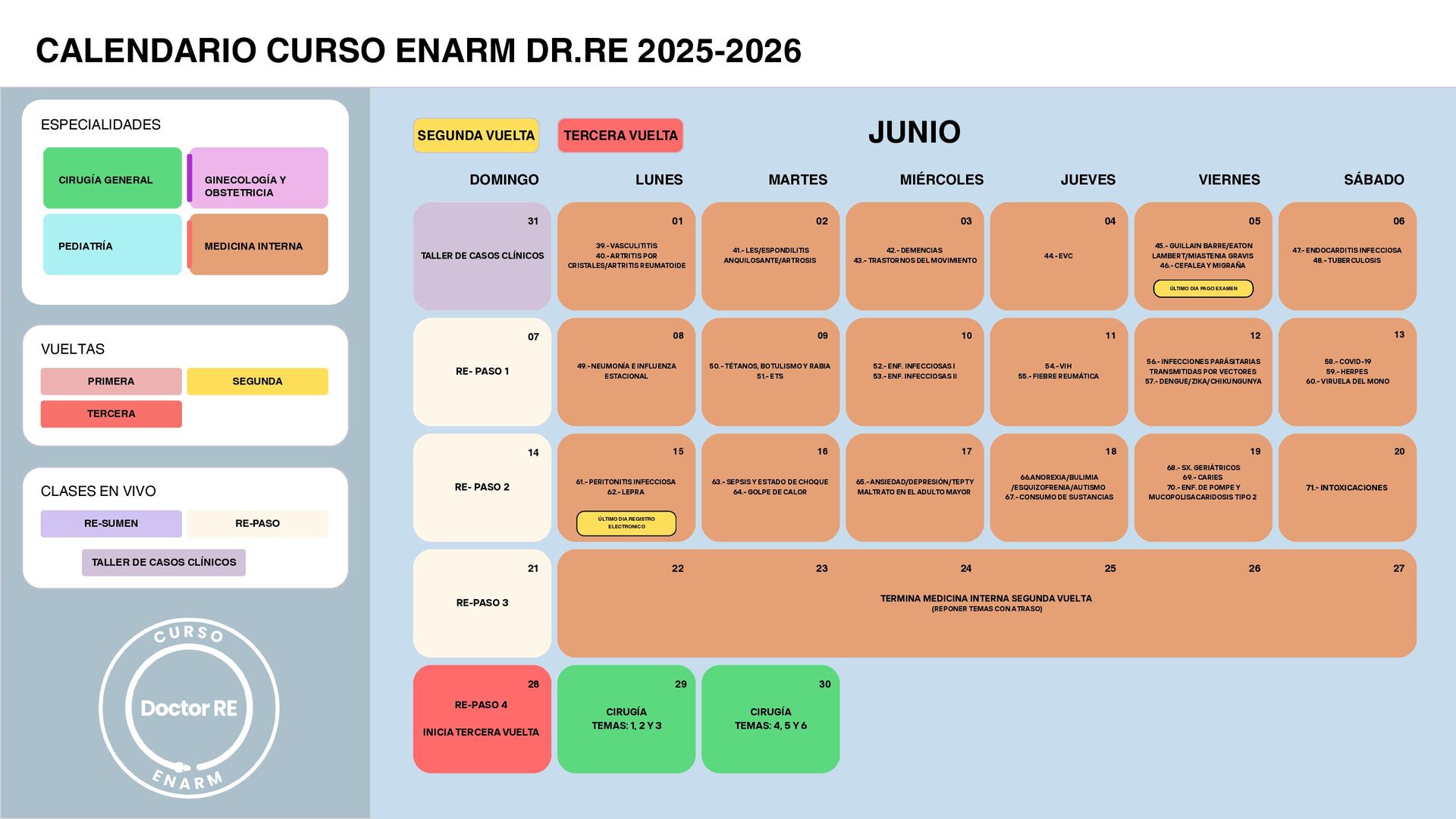 RE-PASO 4 INICIA TERCERA VUELTA SÁBADO VIERNES JUEVES MIÉRCOLES JUNIO MARTES LUNES TALLER DE CASOS CLÍNICOS 31 DOMINGO 07 14 21 28 PRIMERA SEGUNDA TERCERA VUELTAS ESPECIALIDADES CIRUGÍA GENERAL GINECOLOGÍA Y OBSTETRICIA PEDIATRÍA MEDICINA INTERNA CALENDARIO CURSO ENARM DR.RE 2025-2026 RE-SUMEN RE-PASO CLASES EN VIVO TALLER DE CASOS CLÍNICOS TERCERA VUELTA TERMINA MEDICINA INTERNA SEGUNDA VUELTA (REPONER TEMAS CON ATRASO) 27 26 25 24 23 22 CIRUGÍA TEMAS: 4, 5 Y 6 CIRUGÍA TEMAS: 1, 2 Y 3 30 29 07 06 05 04 O3 02 47.- ENDOCARDITIS INFECCIOSA 48.- TUBERCULOSIS 45.- GUILLAIN BARRE/EATON LAMBERT/MIASTENIA GRAVIS 46.- CEFALEA Y MIGRAÑA 58.- COVID-19 59.- HERPES 60.- VIRUELA DEL MONO 56.- INFECCIONES PARÁSITARIAS TRANSMITIDAS POR VECTORES 57.- DENGUE/ZIKA/CHIKUNGUNYA 71.- INTOXICACIONES 68.- SX. GERIÁTRICOS 69.- CARIES 70.- ENF. DE POMPE Y MUCOPOLISACARIDOSIS TIPO 2 44.- EVC 54.- VIH 55.- FIEBRE REUMÁTICA 66.ANOREXIA/BULIMIA /ESQUIZOFRENIA/AUTISMO 67.- CONSUMO DE SUSTANCIAS 42.- DEMENCIAS 43.- TRASTORNOS DEL MOVIMIENTO 52.- ENF. INFECCIOSAS I 53.- ENF. INFECCIOSAS II 65.- ANSIEDAD/DEPRESIÓN/TEPT Y MALTRATO EN EL ADULTO MAYOR 41.- LES/ESPONDILITIS ANQUILOSANTE/ARTROSIS 50.- TÉTANOS, BOTULISMO Y RABIA 51.- ETS 63.- SEPSIS Y ESTADO DE CHOQUE 64.- GOLPE DE CALOR 39.- VASCULITITIS 40.- ARTRITIS POR CRISTALES/ARTRITIS REUMATOIDE 49.- NEUMONÍA E INFLUENZA ESTACIONAL 61.- PERITONITIS INFECCIOSA 62.- LEPRA 06 05 13 12 20 19 04 11 18 03 10 17 02 09 16 01 08 15 ÚLTIMO DIA PAGO EXAMEN ÚLTIMO DIA REGISTRO ELECTRONICO