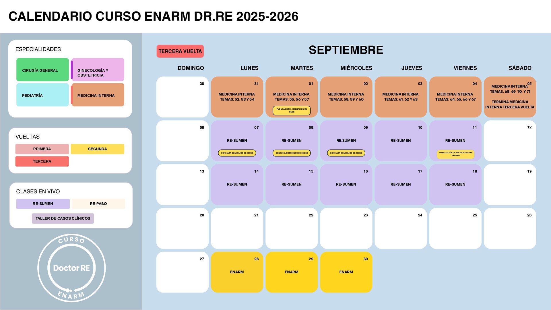 INTERNA TERCERA VUELTA TERCERA VUELTA MEDICINA INTERNA TEMAS: 64, 65, 66 Y 67 RE-SUMEN RE-SUMEN MEDICINA INTERNA TEMAS: 61, 62 Y 63 RE-SUMEN RE-SUMEN MEDICINA INTERNA TEMAS: 58, 59 Y 60 RE.SUMEN RE-SUMEN MEDICINA INTERNA TEMAS: 55, 56 Y 57 RE-SUMEN RE-SUMEN MEDICINA INTERNA TEMAS: 52, 53 Y 54 RE-SUMEN RE-SUMEN 05 SÁBADO 04 VIERNES 12 11 19 18 26 25 03 JUEVES 10 17 24 02 MIÉRCOLES SEPTIEMBRE 09 16 23 ENARM 30 01 MARTES 08 15 22 ENARM 29 31 LUNES 07 14 21 ENARM 28 30 DOMINGO 06 13 20 27 PRIMERA SEGUNDA TERCERA VUELTAS ESPECIALIDADES CIRUGÍA GENERAL GINECOLOGÍA Y OBSTETRICIA PEDIATRÍA MEDICINA INTERNA CALENDARIO CURSO ENARM DR.RE 2025-2026 RE-SUMEN RE-PASO CLASES EN VIVO TALLER DE CASOS CLÍNICOS PUBLICACIÓN Y ASIGNACIÓN DE SEDE CONSULTA DOMICILIOS DE SEDES CONSULTA DOMICILIOS DE SEDES CONSULTA DOMICILIOS DE SEDES PUBLICACIÓN DE INSTRUCTIVO DE EXAMEN